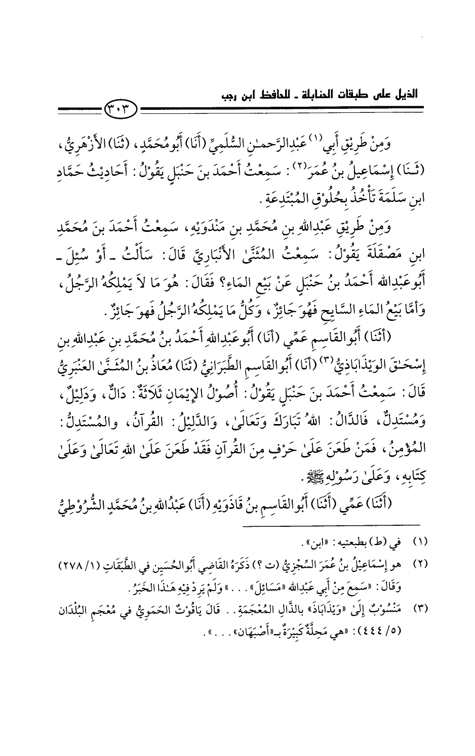 أَخْبَرَنَا أَبُو القاسم عمي، أَخْبَرَنَا أَبُو عبد الله أحمد بن محمد بن عبد الله بن إسحاق الويذاباذي، أَخْبَرَنَا أَبُو القاسم الطبراني، حَدَّثَنَا معاذ بن المثنى العنبري قَالَ: سمعتُ أحمد بن حنبل يقول: أصول الإيمان ثلاثة: دال، ودليل، ومستدل. فالدال: الله تبارك وتعالى، والدليل: القرآن، والمستدل: المؤمن. فمن طعن على حرف من القرآن فقد طعن على الله تعالى وعلى كتابه وعلى رسوله صَلَّى اللَّهُ عَلَيْهِ وَسَلَّمَ.