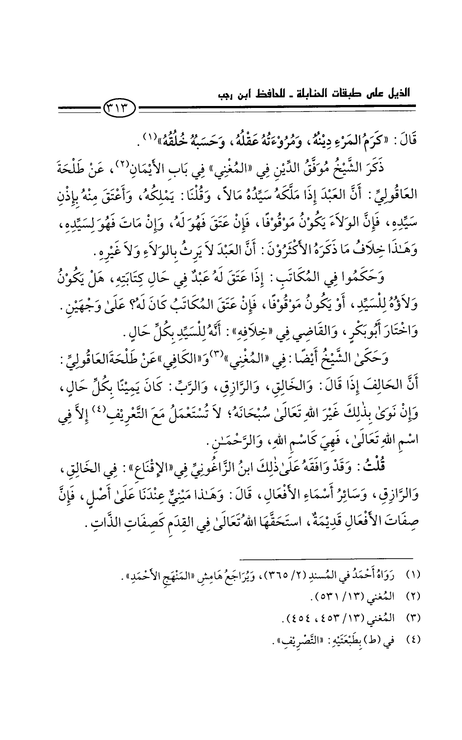 وحكى الشيخ أيضَا في المغني والكافي عن طلحة العاقولي: أن الحالف إذا قَالَ: والخالقِ، والرزاقِ، والربِّ: كان يمينا بكل حال، وإن نوى بذلك غير الله تعالى سُبحانه لأنها لا تستعمل مع التصريف إلا في اسم الله تعالى، فهي كاسم الله، والرحمان.