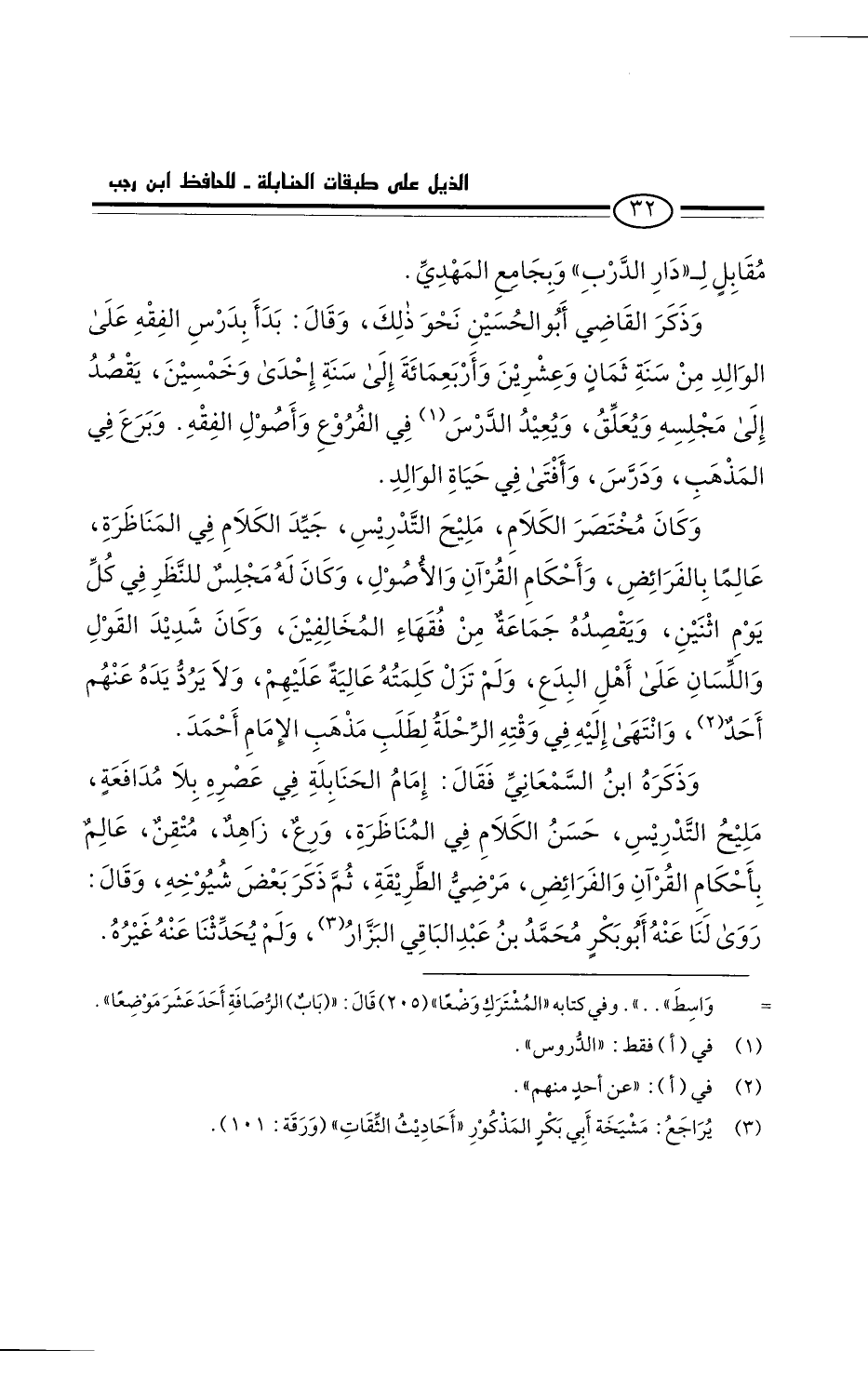 وكان مختصر الكلام، مليح التَّدريس، جيد الكلام في المناظرة، عالما بالفرائضِ، وأحكام القراَن والأصول. وكان له مجلسٌ للنظر في كل يوم اثنين ويقصده جماعة من فقهاء المخالفين. وكان شديد القول واللسان على أهل البدع ولم تزل كلمته عالية عليهم، ولا يَردُّ يَده عنهم أحد. وانتهى إليه في وَقتهِ الرحلة لطلب مذهب الإمام أحمد.