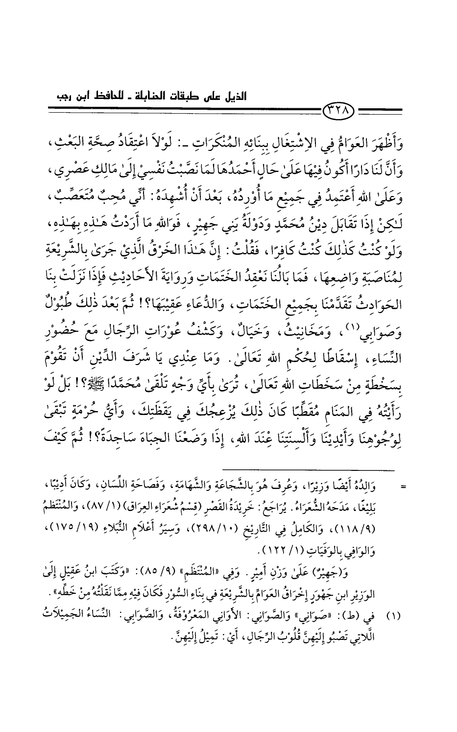 لولا اعتقاد صحة البعث، وأن لنا دارا أكون فيها على حال أحمدها، لما نصبت نفسي إلى مالك عصري، وعلى الله أعتمد في جميع ما أورده، بعد أن أشهده: أني محبٌ متعصبٌ. لكن إذا تقابل دين محمد ودولة بني جهير، فوالله ما أردت هذه بهذه، ولو كنت كذلك كنت كافرا. فقلت: إن هذا الخرق الذي جرى بالشريعة لمناصبة واضعها. فما بالنا نعقد الختمات ورواية الأحاديث؟ فإذا نزلت بنا الحوادث تقدمنا بجميع الختمات، والدعاء عقيبها، ثم بعد ذلك طبول وصَواني، ومخانيث، وخيال، وكشف عورات الرجال مع حضور النساء، إسقاطا لحكم الله تعالى.