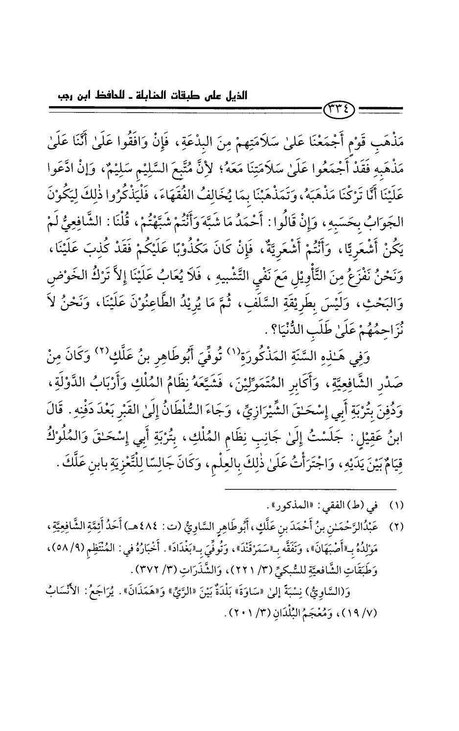 مَذهب قومٍ أجمعنا على سلامتهم من البدعة. فإن وافقوا على أننا على مذهبه فقد أجمعوا على سلامتنا معه؟ لأن متبع السليم سليم. وإن ادعوا علينا أنا تركنا مذهبه، وتمذهبنا بما يخالف الفقهاء، فليذكروا ذلك ليكون الجواب بحسبه. وإن قالوا: أحمد ما شبَّه وأنتم ما شبَّهتم، قلنا: الشافعي لم يكن أشعريا، وأنتم أشعرية. فإن كان مكذوبا عليكم فقد كذب علينا. ونحن نفزع من التأويل مع نفي التشبيه، فلا يُعَاب علينا إلا ترك الخوض والبحث وليس بطريقة السلف. ثم ما يريد الطاعنون علينا، ونحن لا نزاحمهم على طلب الدنيا.