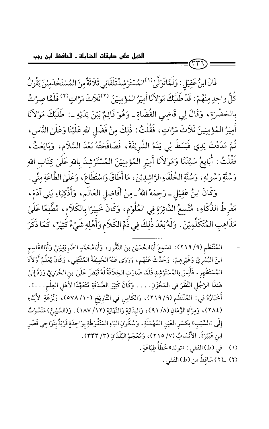 قال ابن عقيل: ولما تولد المسترشد تلقاني من المستخدمين يقول كل واحد منهم: قد طلبك مولانا أمير المؤمنين. فلما صرت بالحضرة، وقال لي قاضي القضاة - وهو قائم بين يديه -: طلبك مولانا أمير المؤمنين ثلاث مرات، فقلت: ذلك من فضل الله علينا وعلى الناس. ثم مددتُ يدي فبسط لي يده الشريفة، فصافحته بعد السلام، وبايعتُ، فقلتُ: أبايعُ سيدنا ومولانا أميرَ المؤمنين المسترشد بالله على كتاب الله وسنة رسوله، وسنة الخلفاء الراشدين، ما أطاق واستطاع، وعلى الطاعة مني.