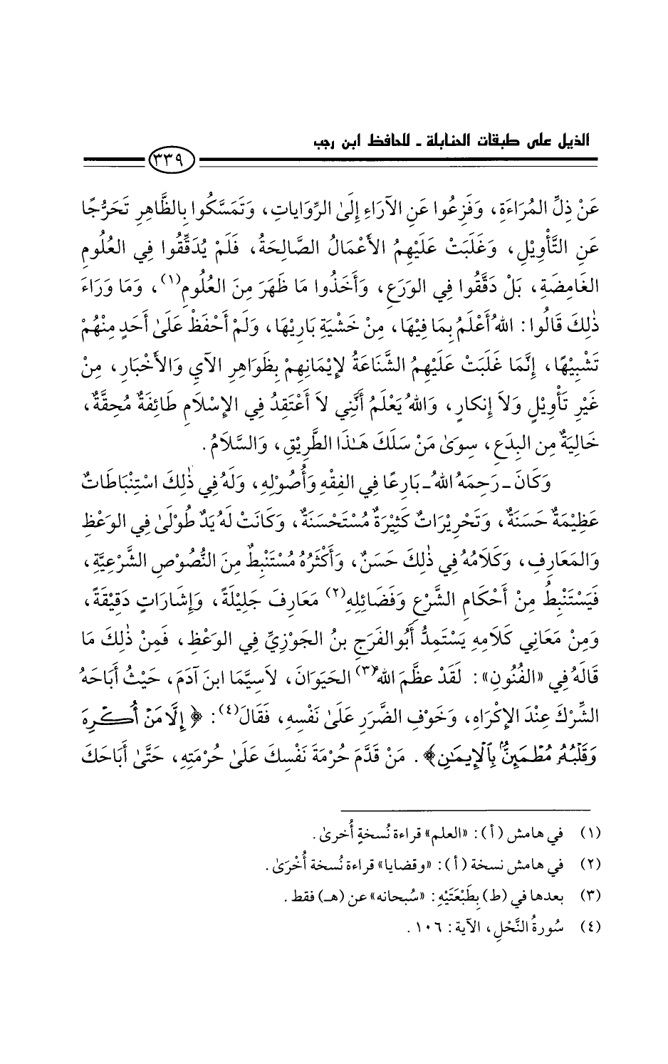 فمن ذلك ما قاله في الفنون: لقد عظم الله سبحانه الحيوان، لا سيما ابن آدم، حيث أباحه الشرك عند الإكراه، وخوف الضرر على نفسه، فقال: " إلاَّ مَنْ أكْرهَ وَقَلْبُهُ مُطْمَئِنٌّ بِالإِيمَانِ " النحل: ١٠٦.