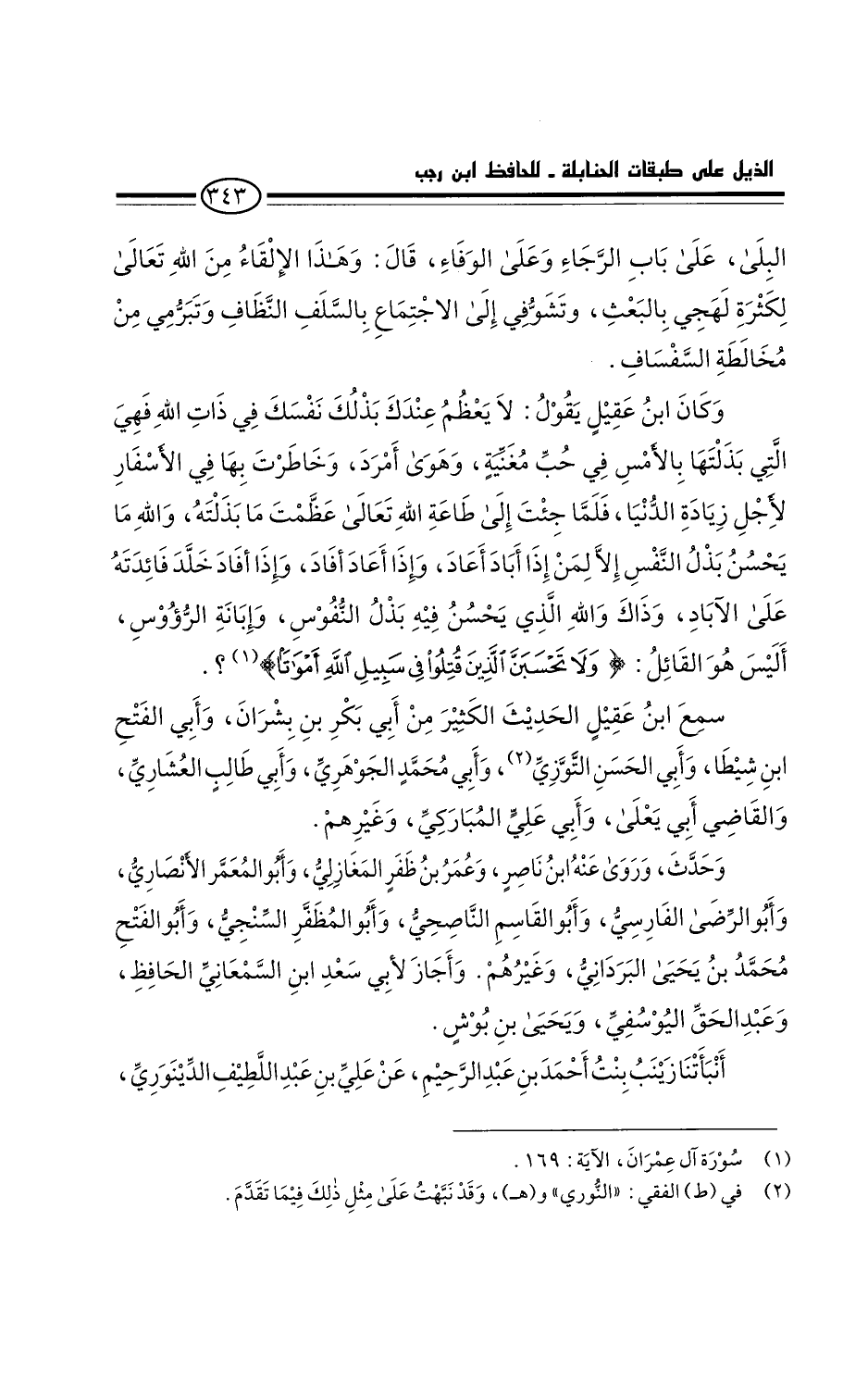 وكان ابن عقيل يقول: لا يعظم عندكَ بَذْلُك نفسك في ذاتِ الله فهي التي بذلتها بالأمس في حب مغنية، وهوى أمرد، وخاطرتَ بها في الأسفار لأجل زيادة الدنيا. فلما جئت إلى طاعة الله تعالى عظمت ما بذلتَه، والله ما يحسن بذل النفس إلا لمن إذا أباد أعاد، وإذا أعاد أفاد، وإذا أفاد خلد فائدته على الآباد. وذاك الله الذي يحسن فيه بذل النفوس، وإبانة الرءوس. أليس هو القائل: " وَلاَ تَحْسَبَن الذِينَ قُتِلُوا فِي سَبِيلِ اللهِ أمْوَاتًا " آل عمران: ١٧٠.