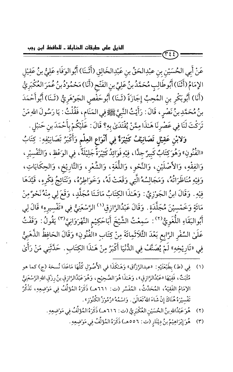 وقال عبد الرزاق الرسعني في تفسيره. قَالَ لي أَبُو البقاء اللغوي: سمعتُ الشيخ أبا حكيم النهرواني يقول: وقفتُ على السَّفر الرابع بعد الثلاثمائة من كتاب الفنون.