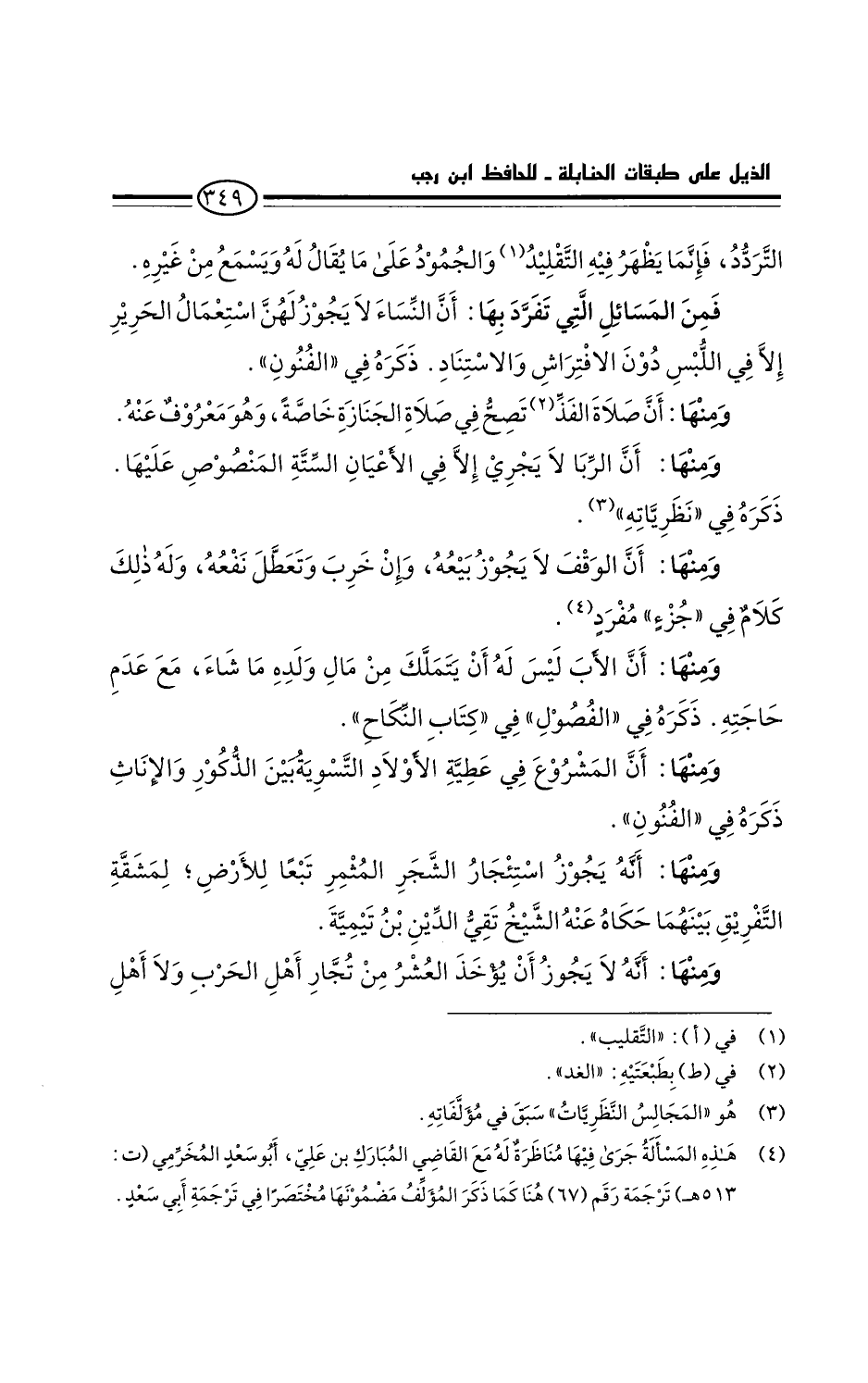 فمن المسائل التي تفرَّد بها: أن النساء لا يجوز لهن استعمال الحرير في اللبس دون الافتراش والاستناد. ذكره في الفنون.