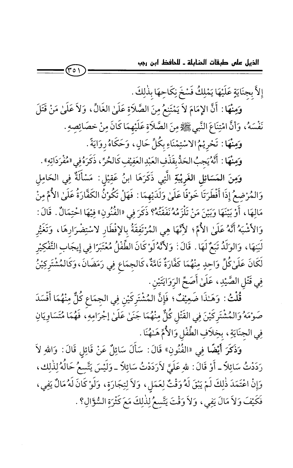 ومن المسائل الغريبة التي ذكرها ابن عقيل: مسألة في الحامل والمرضع إذا أفطرتا خوفا على ولديهما: فهل تكون الكفارة على الأم من مالها، أو بينها وبين من تلزمه نفقته. ذكر في الفنون: فيها احتمال.