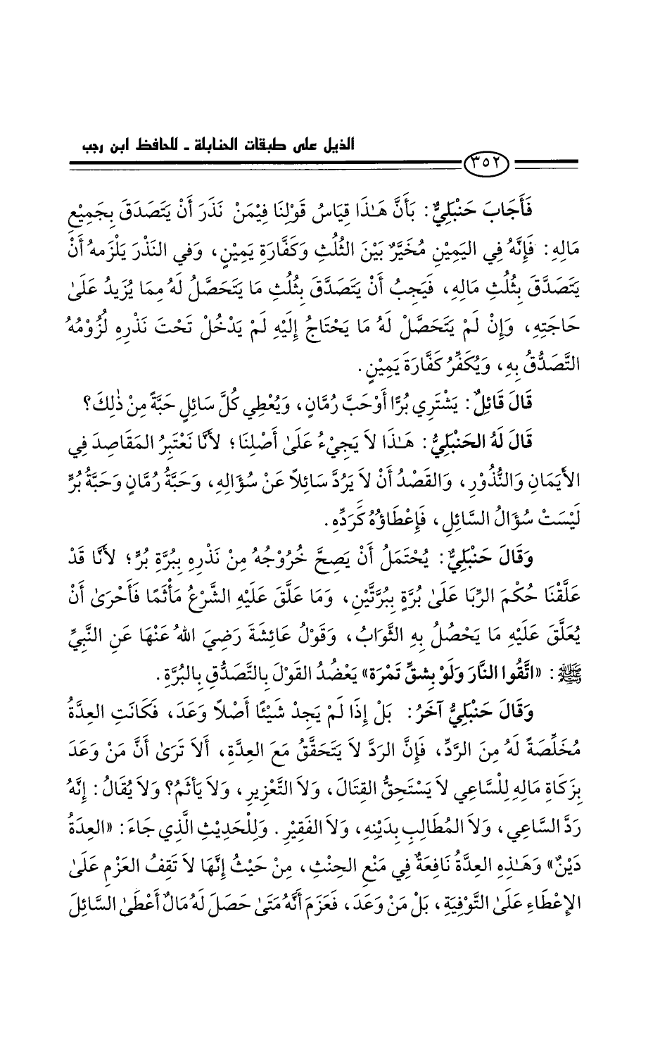 وقال حنبلي آخر: بل إذا لم يجد شيئا أصلا وَعَدَ، فكانت العِدة مخلصة له من الرد. فإن الردَّ لا يتحقق مع العِدة. ألا ترى أن من وَعَد بزكاة ماله للساعي لا يستحق القتال، ولا التغرير، ولا يأثم؟ ولا يقال: إنه ردَّ الساعي ولا المطالب بدينه، ولا الفقير. وللحديث الذي جاء: " العِدَةُ دَيْنٌ " وهذه العدة نافعة في منع الحنث، من حيث إنها لا تقف مع العزم على الإعطاء على التوفية، بل من وعد فعزم أنه متى حصل له مال أعطى السائل