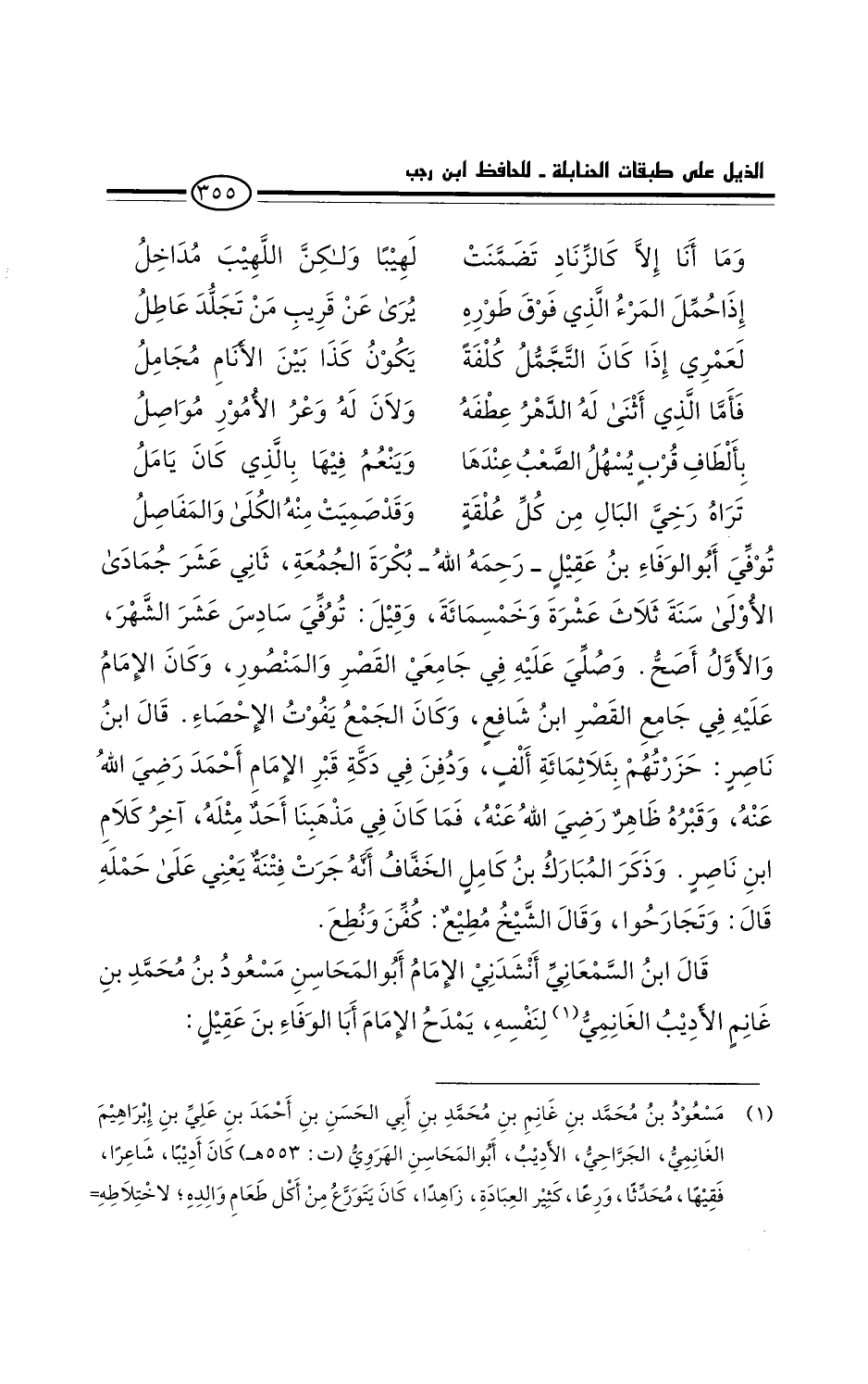قال بن السمعاني، أنشدني، الإمام أَبُو المحاسن مسعود بن محمد بن غانم الأديب الغانمي لنفسه يمدح الإمام أبا الوفاء بن عقيل: