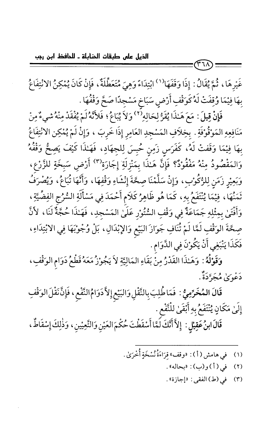 فإن قيل: مع هذا يُقَر لحاله، ولا يباع فلأنه لم يفقد منه شيء من منافعه الموقوفة. بخلاف المسجد العامر إذا خرب، وإنْ لم يمكن الانتفاع بها فيما وقفتْ له، كفرس زَمِنٍ حُبس للجهاد، فهذا كيف يصح وَقفهُ والمقصود منه مفقود؟ فإن هذا بمنزلة إجازة أرض سَبِخة لنزع، وبعير زَمِن للركوب. وإنْ سلَّمنا صحة إنشاء وقفها، وأنها تباع، ويُصرف ثمنها، فيما ينتفعُ به، كما هو ظاهر كلام أحمد في مسألة السرج الفضية.