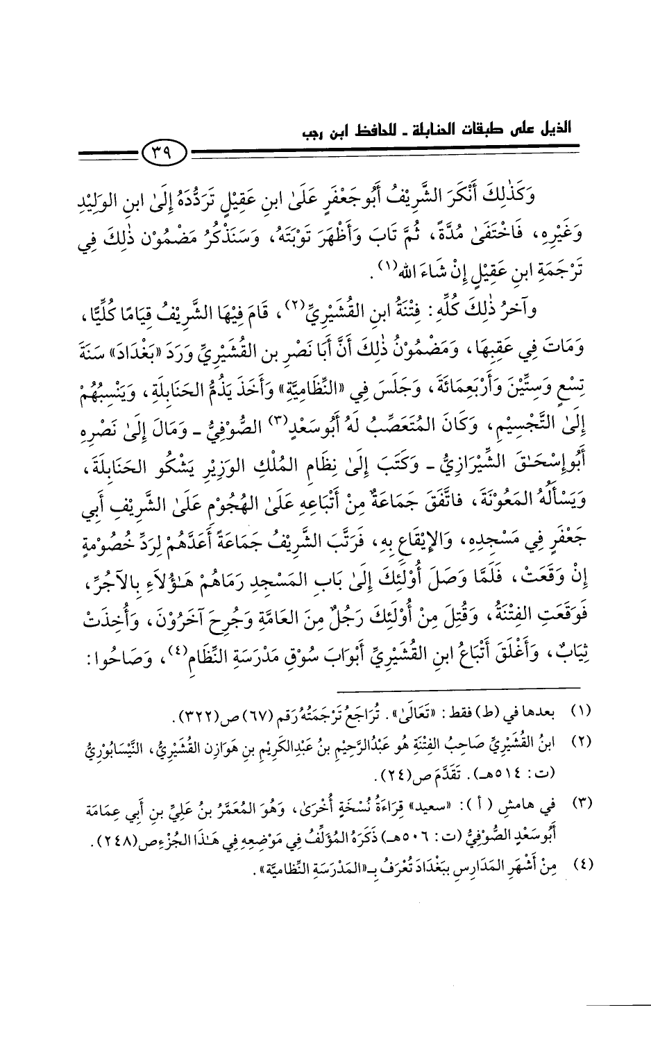 ومضمون ذلك: أن أبا نصر بن القشيري ورد بغداد، سنة تسع وستين وأربعمائة، وجلس في النظامية. وأخذ يذم الحنابلة، وينسبهم إلى التجسيم. وكان المتعصب له أَبُو سعد الصوفي، ومال إلى نصره أَبُو إسحاق الشيرازي، وكتب إلى نظام الملك الوزير يشكو الحنابلة، ويسأله المعونة. فاتفق جماعة من أتباعه على الهجوم على الشريف أبي جعفر في مسجده، والإيقاع به، فرتب الشريف جماعة أعدهم لرد خصومه إن وقعت. فلما وصل أولئك إلى باب المسجد رماهم هؤلاء بالآجر. فوقعت الفتنة، وقتل من أولئك رجل من العامة، وجرح آخرون، وأخذت ثياب.