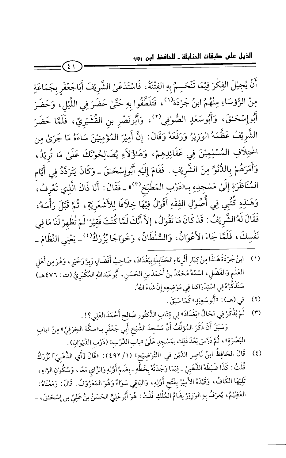 أن يجيل الفكر فيما تنحسم به الفتنة. فاستدعى الشريف أبا جعفر بجماعة من الرؤساء منهم ابن جردة، فتلطفوا به حتى حضر في الليل، وحضر أَبُو إسحاق، وأَبُو سعد الصوفي، وأَبُو صر بن القشيري. فلما حضر الشريف عظَّمه الوزير ورفعه، وقال: إن أمير المؤمنين ساءه ما جرى من اختلاف المسلمين في عقائدهم، وهؤلاء يصالحونك على ما تريد، وأَمَرهم بالدنو من الشريف. فقام إليه أَبُو إسحاق، وكان يتردد في أيام المناظرة إلى مسجده بدرب المطبخ، فقال: أنا ذاك الذي تعرف، وهذه كتبي في أصول الفقه، أقول فيها: خلافًا للأشعرية، ثم قبل رأسه.