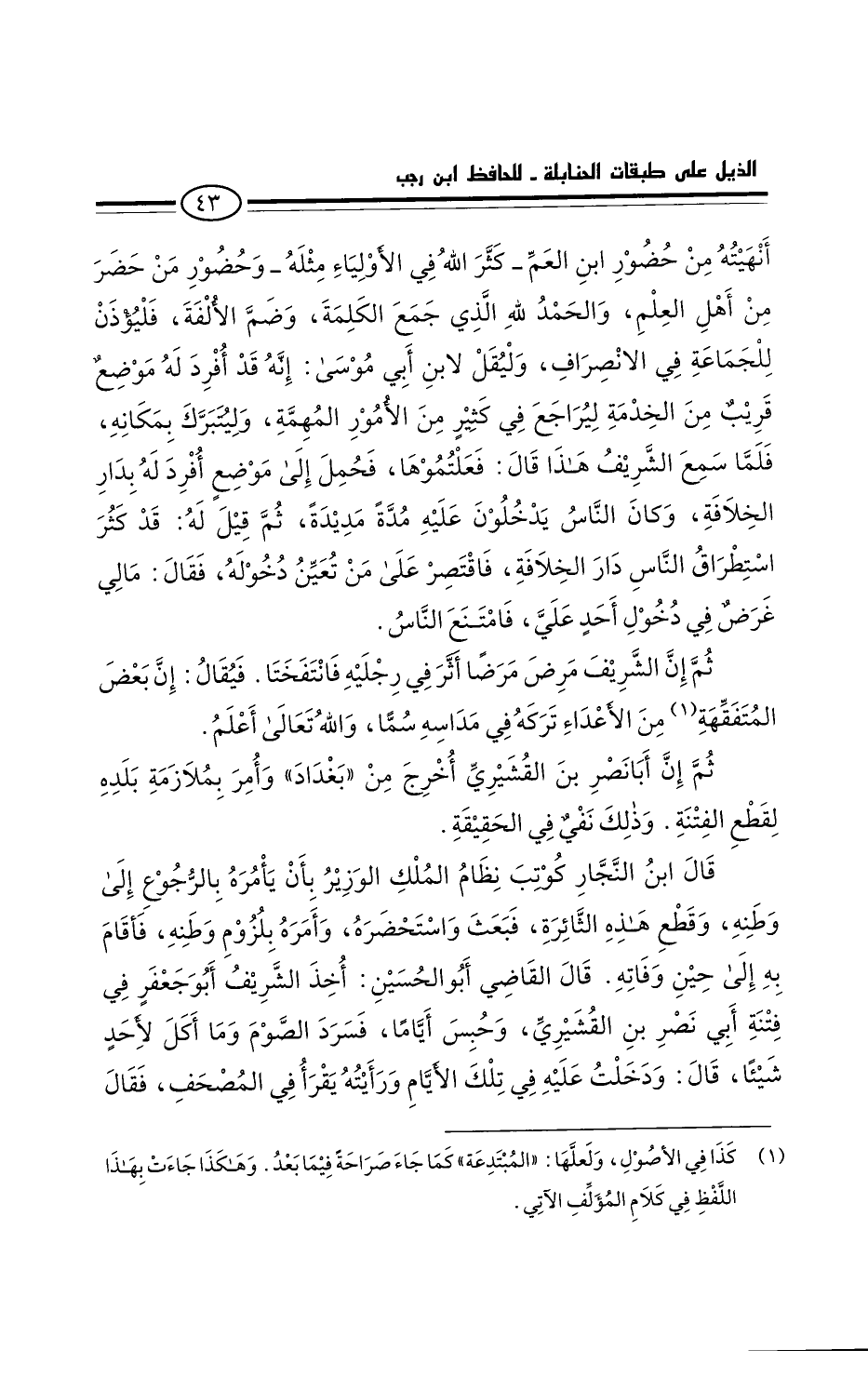 أنهيته من حضور ابن العم - كَثر اللهُ في الأولياء مثلَه - وحضور من حضر من أهل العلم. والحمد لله الذي جمع الكلمة، وضم الألفة، فليؤذن للجماعة في الانصراف، وليقل لابن أبي موسى: إنه قد أفرد له موضع قريبٌ من الخدمة ليراجَع في كثير من الأمور المهمة، وليتبرك بمكانه.