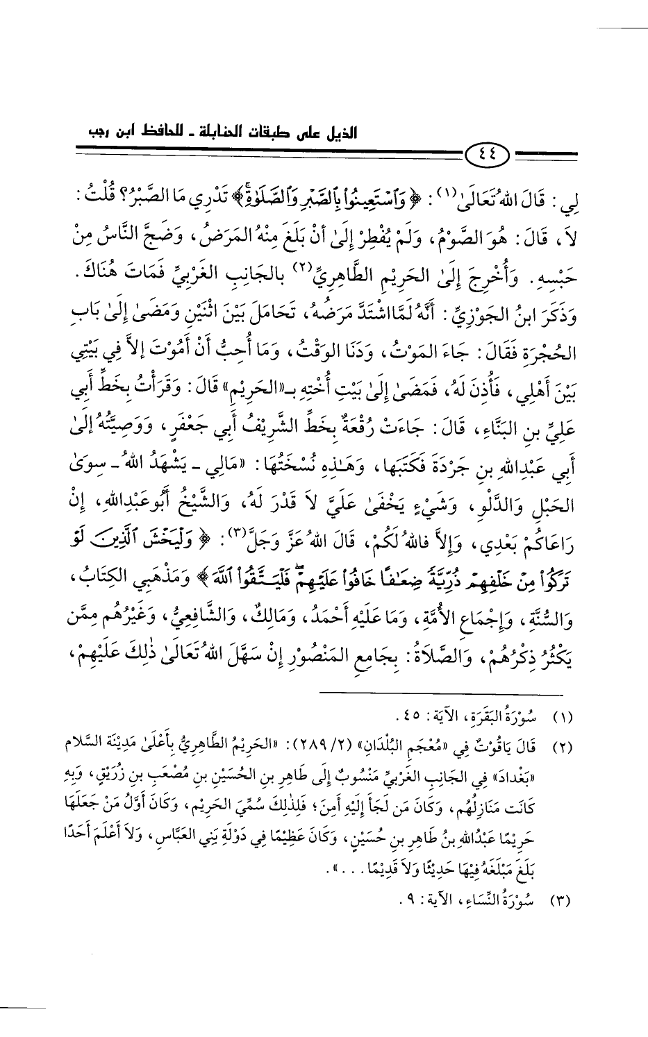 لي: قَالَ الله تعالى: " وَاسْتَعِينُوا بِالصَّبْرِ وَاَلصَّلاَةِ " البقرة: ٤٥، تدري ما الصبر؟ قلت: لا، قَالَ: هو الصوم. ولم يفطر إلى أن بلغ منه المرض، وضج الناس من حبسه. وأُخرج إلى الحريم الطاهري بالجانب الغربي فمات هناك.