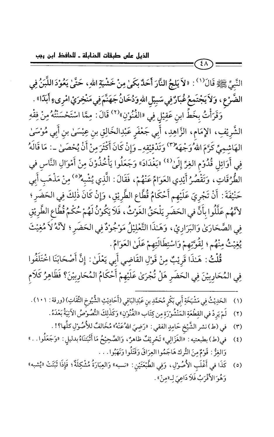 وقرأت بخط ابن عقيل في الفنون قَالَ: مما استَحسنتُه من فقه الشريف الإمام الزاهد أبي جعفر عبد الخالق بن عيسى بن أبي موسى الهاشمي رضي الله عنه وتدقيقه - وإن كان أكثر من أن يُحصى -: ما قاله في أوائل قدوم الغزالي بغداد، وجعلوا يأخذون من أموال الناس في الطرقات، وتقصر أيدي العوام عنهم، فقال: الذي نسبه من مذهب أبي حنيفة: أن تجري عليهم أحكام قطاع الطريق، وإن كان ذلك في الحضر. لأنهم عللوا بأن في الحضر يلحق الغوث، فلا يكون لهم حكم قطاع الطريق في الصحاري والبراري. وهذا التعليل موجود في الحضرة لأنه لا مغيث يغيث منهم، لقوتهم واستطالتهم على العوام.