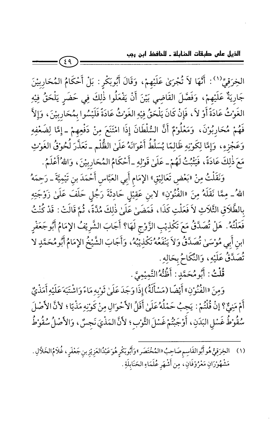 ونقلت من بعض تعاليق الإمام أبي العباس أحمد بن تيمية رحمه الله. مما نقله من الفنون لابن عقيل: حادثة رجل حلف على زوجته بالطلاق الثلاث: لا فعلتِ كذا، فمضى على ذلك مدة، ثم قالت: قد كنتُ فعلتُه. هل تصدق مع تكذيب الزوج لها. أجاب الشريف الإمام أَبُو جعفر بن أبي موسى: تُصَدَّق ولا ينفعه تكذيبه. وأجاب الشيخ الإمام أَبُو محمد: لا تصدق عليه، والنكاح بحاله.