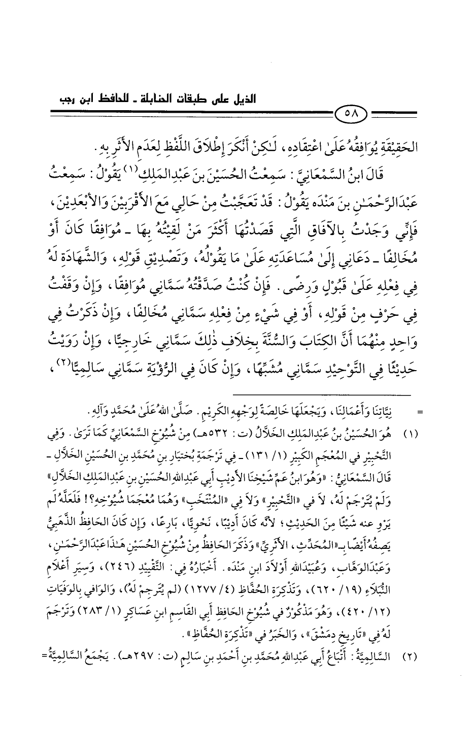 قال ابن السمعاني: سمعتُ الحسين بن عبد الملك يقول: سمعتُ عبد الرحمن بن منده يقول: قد تعجبتٌ من حالي مع الأقربين والأبعدين، فإني وَجَدتُ بالآَفاق التي قصدتها أكثر من لقيتُه بها - موافقا كان أو مخالفا - دعاني إلى مساعدته على ما يقوله، وتصديق قولي، والشهادة له في فعله على قبولٍ ورضى. فإن كنت صَدَّقته: سماني مُوافقًا، وإن وقفت في حَرْفي من قوله، أو في شيء من فعله: سماني مخالفا - وإن ذكرتُ في واحدٍ منهما أن الكتاب والسنة بخلاف ذلك: سماني خارجيا. وإن روَيتُ حديثا في التوحيد: سماني مشبها. وإن كان في الرؤية: سماني سالميا.
