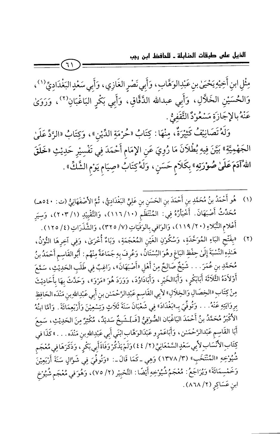 وله تصانيف كثيرة، منها: كتاب " حُزمَة الدين " وكتاب " الرد على الجهمية " بين فيه بطلان ما روي عن الإمام أحمد في تفسير حديث " خَلَقَ اللهُ آدَمَ عَلَى صُورَته " بكلام حسن. وله كتاب " صيام يوم الشك ".