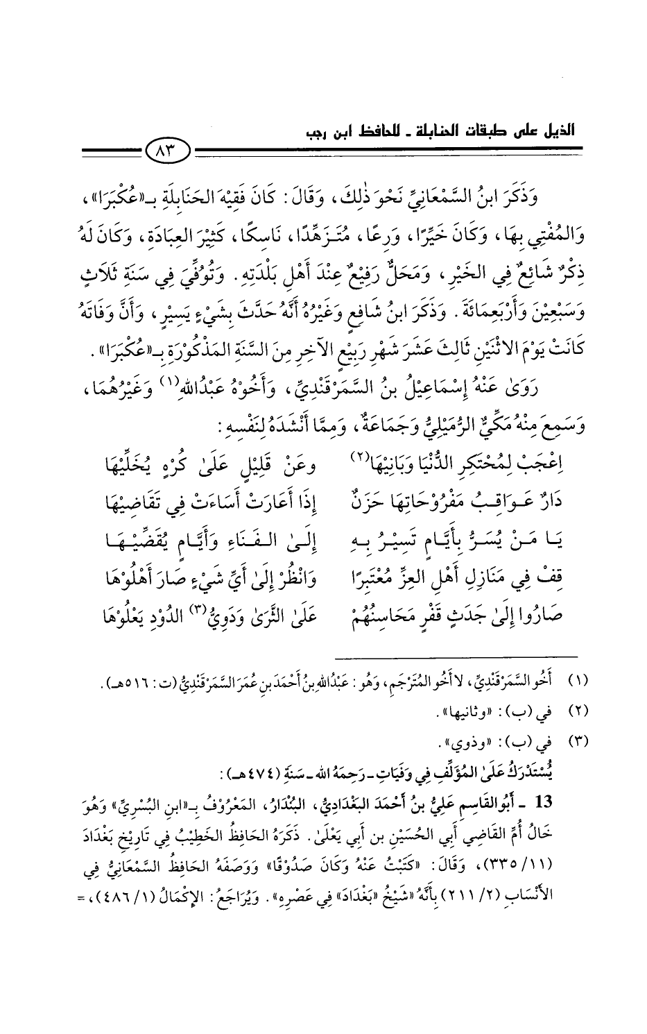 وذكر ابن السمعاني نحو ذلك، وقال: كان فقيه الحنابلة بعكبرا، والمفتي بها. وكان خيرا، ورعا متزهدا، ناسكا كثير العبادة. وكان له ذكر شائع في الخير، ومحل رفيع عند أهل بلدته.