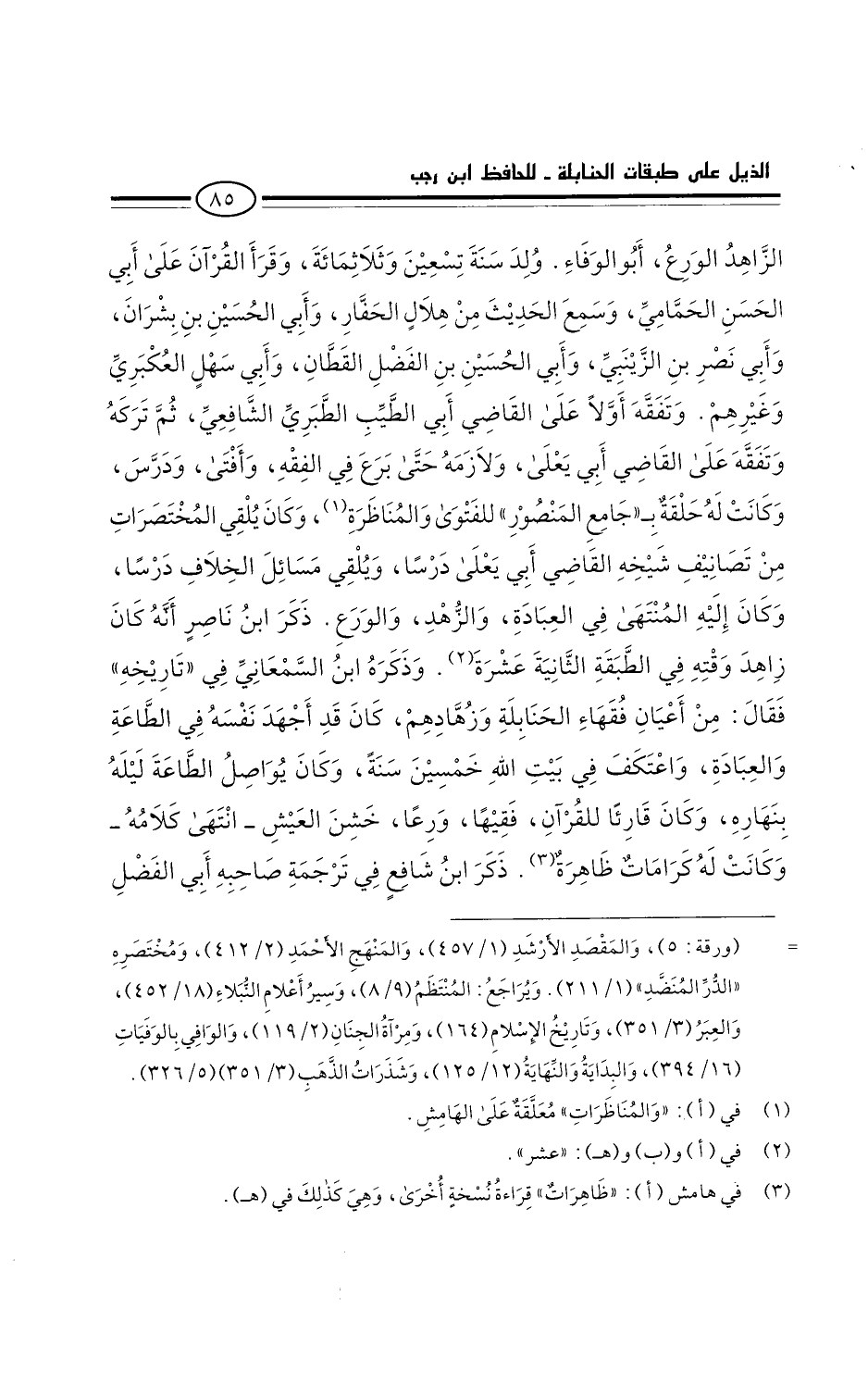 الزاهدُ الوَرعُ، أَبُو الوفاء: وُلد سنة تسعين وثلاثمائة. وقرأ القرآن على أبي الحسن الحمامي، وسمع الحديث من هلال الحفار، وأبي الحسين بن بشران، وأبي نصر بن الزينبي، وأبي الحسين بن الفضل القطان، وأبي سهل العكبري وغيرهم.