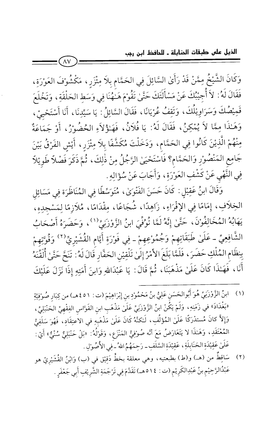وكان الشيخ ممن قد رأى السائل في الحمام بلا مئزر، مكشوف العورة، فقال له: لا أجيبك عن مسألتك حتى تقوم ههنا في وسط الحلقة، وتخلع قميصك وسراويلك، وتقف عريانا، فقال السائل: يا سيدنا، أنا أستحي، وهذا مما لا يمكن، فقال له: يا فلان، فهؤلاء الحضور، أو جماعة منهم الذين كانوا في الحمام، ودخلتَ مكشفا بلا مئزر، إيش الفرق بين جامع المنصور والحمام؟ فاستحيى الرجل من ذلك. ثم ذكر فصلا طويلا في النهي عن كشف العورة، وأجاب عن سؤاله.