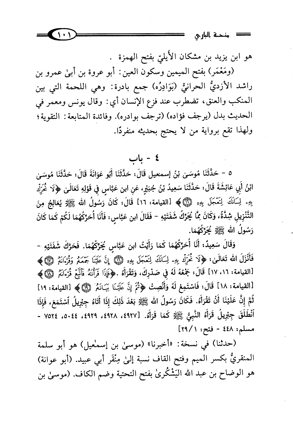 5 - حَدَّثَنَا مُوسَى بْنُ إِسْمَاعِيلَ قَالَ: حَدَّثَنَا أَبُو عَوَانَةَ قَالَ: حَدَّثَنَا مُوسَى بْنُ أَبِي عَائِشَةَ، قَالَ: حَدَّثَنَا سَعِيدُ بْنُ جُبَيْرٍ، عَنِ ابْنِ عَبَّاسٍ فِي قَوْلِهِ تَعَالَى: {لَا تُحَرِّكْ بِهِ لِسَانَكَ لِتَعْجَلَ بِهِ (16)} [القيامة: 16] قَالَ: كَانَ رَسُولُ اللَّهِ صَلَّى اللهُ عَلَيْهِ وَسَلَّمَ يُعَالِجُ مِنَ التَّنْزِيلِ شِدَّةً، وَكَانَ مِمَّا يُحَرِّكُ شَفَتَيْهِ - فَقَالَ ابْنُ عَبَّاسٍ: فَأَنَا أُحَرِّكُهُمَا لَكُمْ كَمَا كَانَ رَسُولُ اللَّهِ صَلَّى اللهُ عَلَيْهِ وَسَلَّمَ يُحَرِّكُهُمَا. وَقَالَ سَعِيدٌ: أَنَا أُحَرِّكُهُمَا كَمَا رَأَيْتُ ابْنَ عَبَّاسٍ يُحَرِّكُهُمَا، فَحَرَّكَ شَفَتَيْهِ - فَأَنْزَلَ اللَّهُ تَعَالَى: {لَا تُحَرِّكْ بِهِ لِسَانَكَ لِتَعْجَلَ بِهِ (16) إِنَّ عَلَيْنَا جَمْعَهُ وَقُرْآنَهُ (17)} [القيامة: 16 - 17] قَالَ: جَمْعُهُ لَكَ فِي صَدْرِكَ, وَتَقْرَأَهُ: {فَإِذَا قَرَأْنَاهُ فَاتَّبِعْ قُرْآنَهُ (18)} [القيامة: 18] قَالَ: فَاسْتَمِعْ لَهُ وَأَنْصِتْ: {ثُمَّ إِنَّ عَلَيْنَا بَيَانَهُ (19)} [القيامة: 19] ثُمَّ إِنَّ عَلَيْنَا أَنْ تَقْرَأَهُ، فَكَانَ رَسُولُ اللَّهِ صَلَّى اللهُ عَلَيْهِ وَسَلَّمَ بَعْدَ ذَلِكَ إِذَا أَتَاهُ جِبْرِيلُ اسْتَمَعَ فَإِذَا انْطَلَقَ جِبْرِيلُ قَرَأَهُ النَّبِيُّ صَلَّى اللهُ عَلَيْهِ وَسَلَّمَ كَمَا قَرَأَهُ.