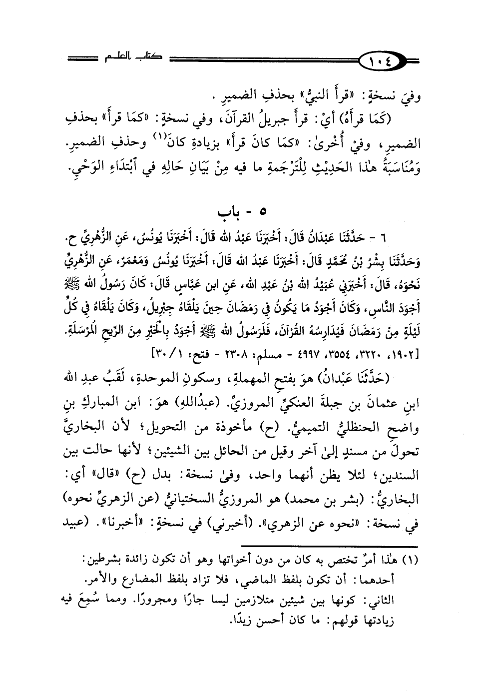 6 - حَدَّثَنَا عَبْدَانُ، قَالَ: أَخْبَرَنَا عَبْدُ اللَّهِ قَالَ: أَخْبَرَنَا يُونُسُ، عَنِ الزُّهْرِيِّ، ح وحَدَّثَنَا بِشْرُ بْنُ مُحَمَّدٍ، قَالَ: أَخْبَرَنَا عَبْدُ اللَّهِ قَالَ: أَخْبَرَنَا يُونُسُ، وَمَعْمَرٌ، عَنِ الزُّهْرِيِّ، نَحْوَهُ قَالَ: أَخْبَرَنِي عُبَيْدُ اللَّهِ بْنُ عَبْدِ اللَّهِ، عَنِ ابْنِ عَبَّاسٍ، قَالَ: "كَانَ رَسُولُ اللَّهِ صَلَّى اللهُ عَلَيْهِ وَسَلَّمَ أَجْوَدَ النَّاسِ، وَكَانَ أَجْوَدُ مَا يَكُونُ فِي رَمَضَانَ حِينَ يَلْقَاهُ جِبْرِيلُ، وَكَانَ يَلْقَاهُ فِي كُلِّ لَيْلَةٍ مِنْ رَمَضَانَ فَيُدَارِسُهُ القُرْآنَ، فَلَرَسُولُ اللَّهِ صَلَّى اللهُ عَلَيْهِ وَسَلَّمَ أَجْوَدُ بِالخَيْرِ مِنَ الرِّيحِ المُرْسَلَةِ" [1902، 3220، 3554، 4997 - مسلم: 2308 - فتح: 1/ 30]