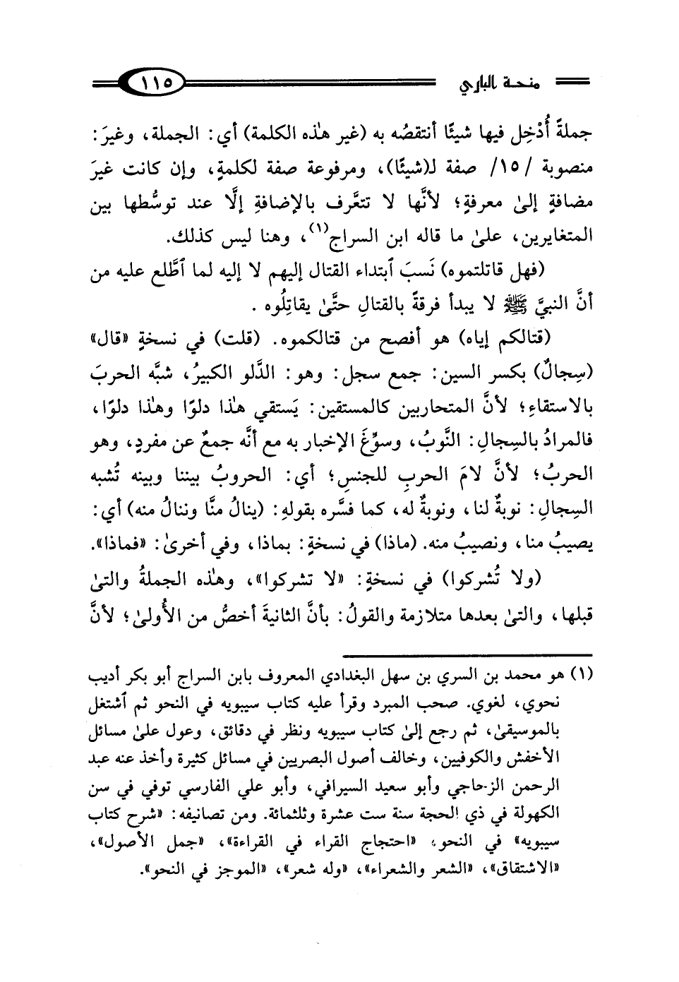 (¬1) هو محمد بن السري بن سهل البغدادي المعروف بابن السراج أبو بكر أديب نحوي، لغوي. صحب المبرد وقرأ عليه كتاب سيبويه في النحو ثم اشتغل بالموسيقى، ثم رجع إلى كتاب سيبويه ونظر في دقائق، وعول على مسائل الأخفش والكوفيين، وخالف أصول البصريين في مسائل كثيرة وأخذ عنه عبد الرحمن الزحاجي وأبو سعيد السيرافي، وأبو علي الفارسي توفي في سن الكهولة في ذي الحجة سنة ست عشرة وثلثمائة. ومن تصانيفه: "شرح كتاب سيبويه" في النحو، "احتجاج القراء في القراءة"، "جمل الأصول"، "الاشتقاق"، "الشعر والشعراء"، "وله شعر"، "الموجز في النحو".