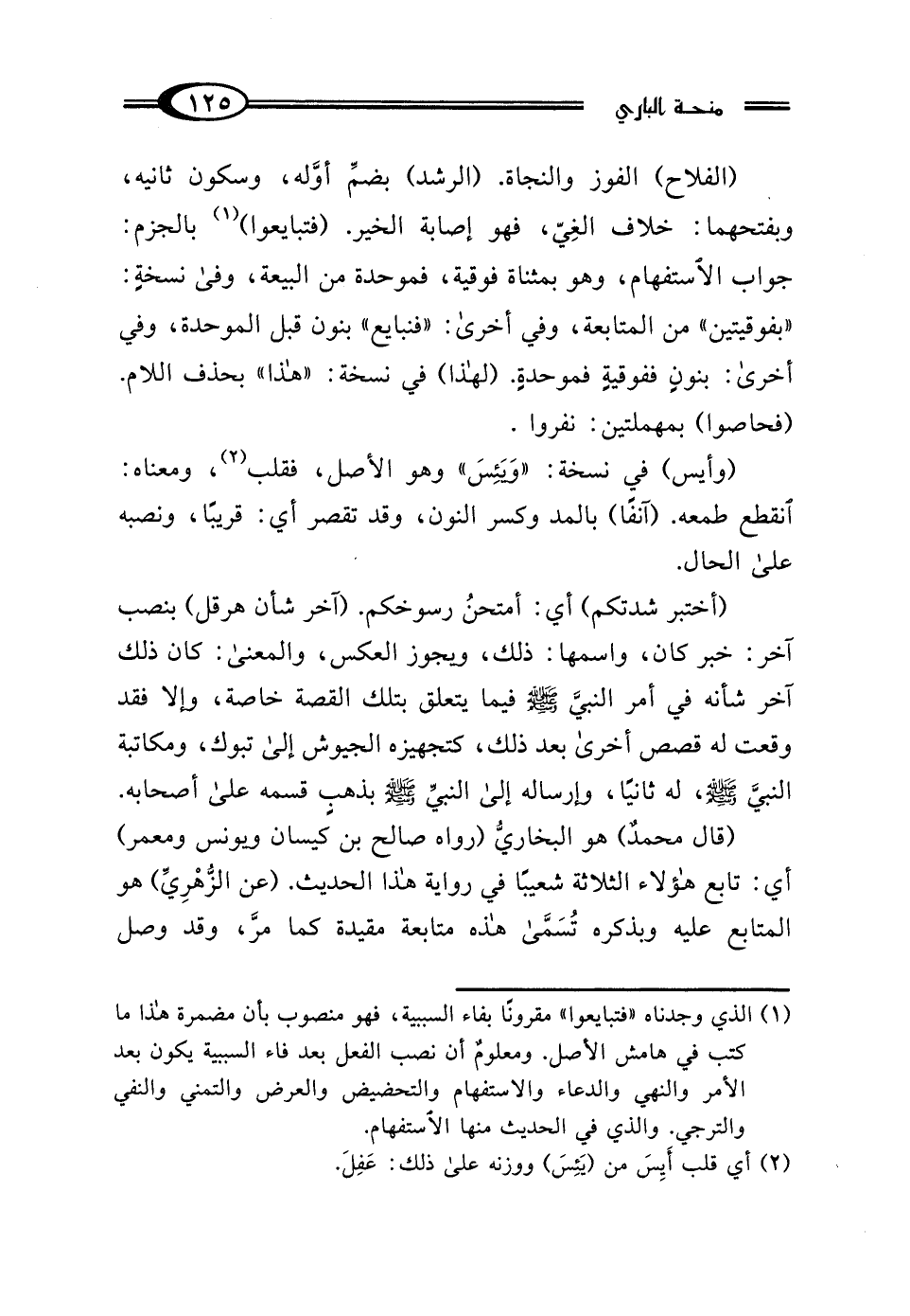 (¬1) الذي وجدناه "فتبايعوا" مقرونًا بفاء السببية، فهو منصوب بأن مضمرة هذا ما كتب في هامش الأصل. ومعلومٌ أن نصب الفعل بعد فاء السببية يكون بعد الأمر والنهي والدعاء والاستفهام والتحضيض والعرض والتمني والنفي والترجي. والذي في الحديث منها الاستفهام.