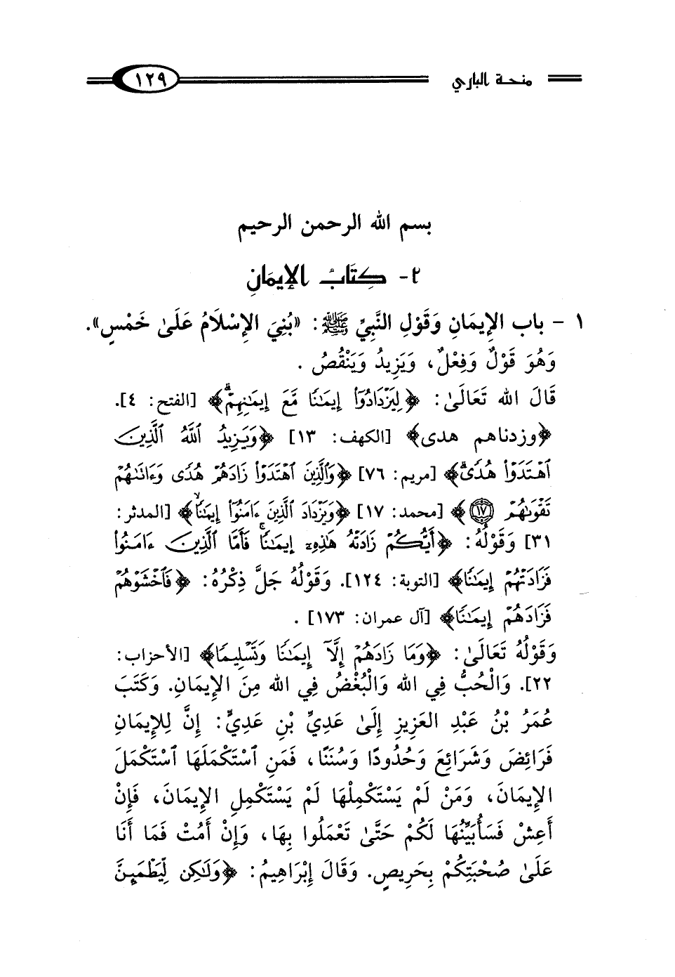 وَقَوْلُهُ تَعَالَى: {وَمَا زَادَهُمْ إلا إِيمَانًا وَتَسْلِيمًا} [الأحزاب: 22] وَالحُبُّ فِي اللَّهِ وَالبُغْضُ فِي اللَّهِ مِنَ الإِيمَانِ " وَكَتَبَ عُمَرُ بْنُ عَبْدِ العَزِيزِ إِلَى عَدِيِّ بْنِ عَدِيٍّ: "إِنَّ لِلْإِيمَانِ فَرَائِضَ، وَشَرَائِعَ، وَحُدُودًا، وَسُنَنًا، فَمَنِ اسْتَكْمَلَهَا اسْتَكْمَلَ الإِيمَانَ، وَمَنْ لَمْ يَسْتَكْمِلْهَا لَمْ يَسْتَكْمِلِ الإِيمَانَ، فَإِنْ أَعِشْ فَسَأُبَيِّنُهَا لَكُمْ حَتَّى تَعْمَلُوا بِهَا، وَإِنْ أَمُتْ فَمَا أَنَا عَلَى صُحْبَتِكُمْ بِحَرِيصٍ" وَقَالَ إِبْرَاهِيمُ: "وَلَكِنْ لِيَطْمَئِنَّ
