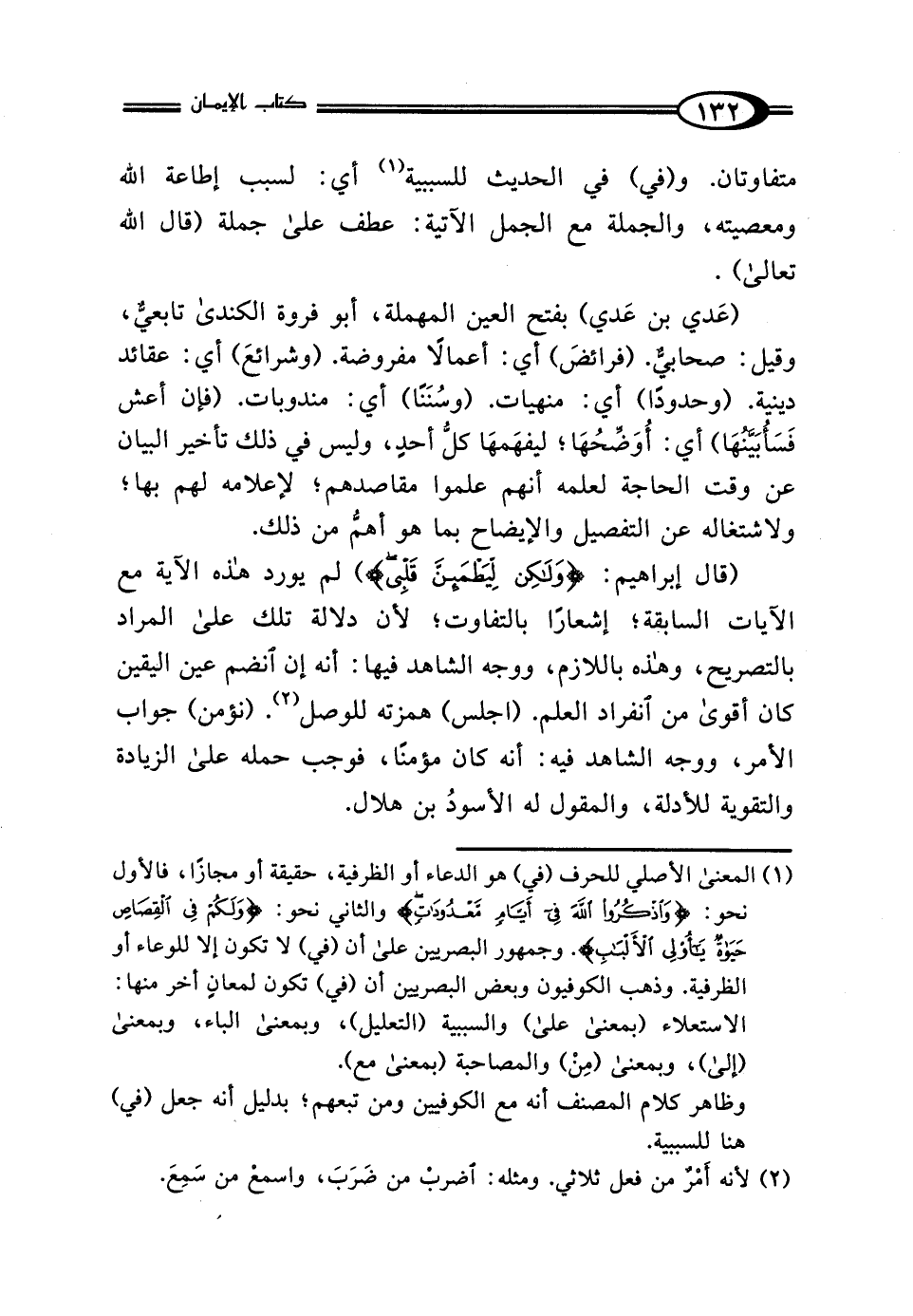 (قال إبراهيم: {وَلَكِنْ لِيَطْمَئِنَّ قَلْبِي}) لم يورد هذه الآية مع الآيات السابقة؛ إشعارًا بالتفاوت؛ لأن دلالة تلك على المراد بالتصريح، وهذه باللازم، ووجه الشاهد فيها: أنه إن انضم عين اليقين كان أقوى من انفراد العلم. (اجلس) همزته للوصل (¬2). (نؤمن) جواب الأمر، ووجه الشاهد فيه: أنه كان مؤمنًا، فوجب حمله على الزيادة والتقوية للأدلة، والمقول له الأسودُ بن هلال.