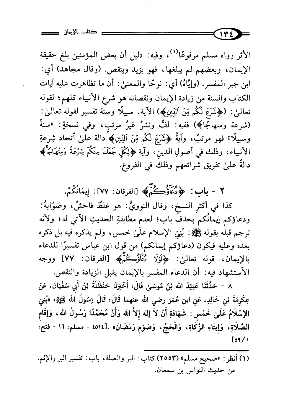 كذا في أكثر النسخِ، وقال النوويُّ: هو غلطٌ فاحشٌ، وصَوابُهُ: ودعاؤكم إيمانُكمَ بحذف باب؛ لعدمِ مطابقةِ الحديثِ الآتي له؛ ولأنه ترجم قبله بقوله - صلى الله عليه وسلم -: بُنيَ الإسلام على خمس، ولم يذكره فيه بل ذكره بعده وعليه فيكون (دعاؤكم إيمانكم) من قول ابن عباس تفسيرًا للدعاء بالإيمان، قوله تعالى: {لَوْلَا دُعَاؤُكُمْ} [الفرقان: 77] ووجه الاستشهاد فيه: أن الدعاء المفسر بالإيمان يقبل الزيادة والنقص.
