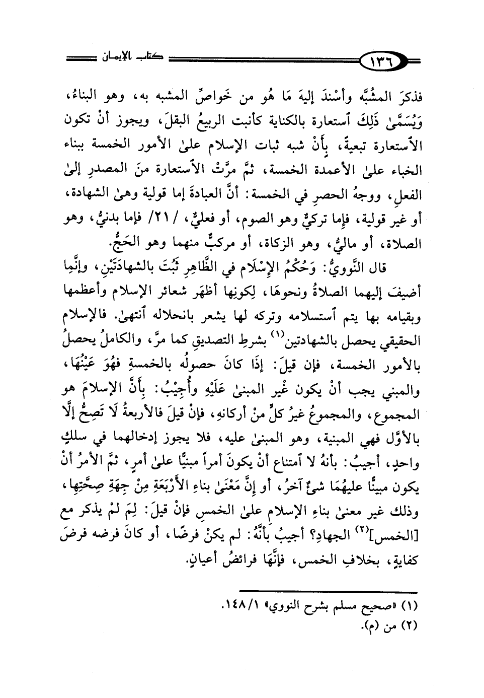 فذكرَ المُشَبَّه وأسْندَ إليهَ مَا هُو من خَواصِّ المشبه به، وهو البناءُ، ويسَمَّى ذَلِكَ استعارة بالكناية كأنبت الربيعُ البقلَ، ويجوز أنْ تكون الاستعارة تبعيةً، بأنْ شبه ثبات الإسلام على الأمور الخمسة ببناء الخباء على الأعمدة الخمسة، ثمَّ مرَّتْ الاستعارة منَ المصدرِ إلى الفعلِ، ووجهُ الحصرِ في الخمسة: أنَّ العبادةَ إما قولية وهي الشهادة، أو غير قولية، فإِما تركيٌّ وهو الصوم، أو فعليٌّ، فإما بدنيُّ، وهو الصلاة، أو ماليُّ، وهو الزكاة، أو مركبٌّ منهما وهو الحَجُّ.