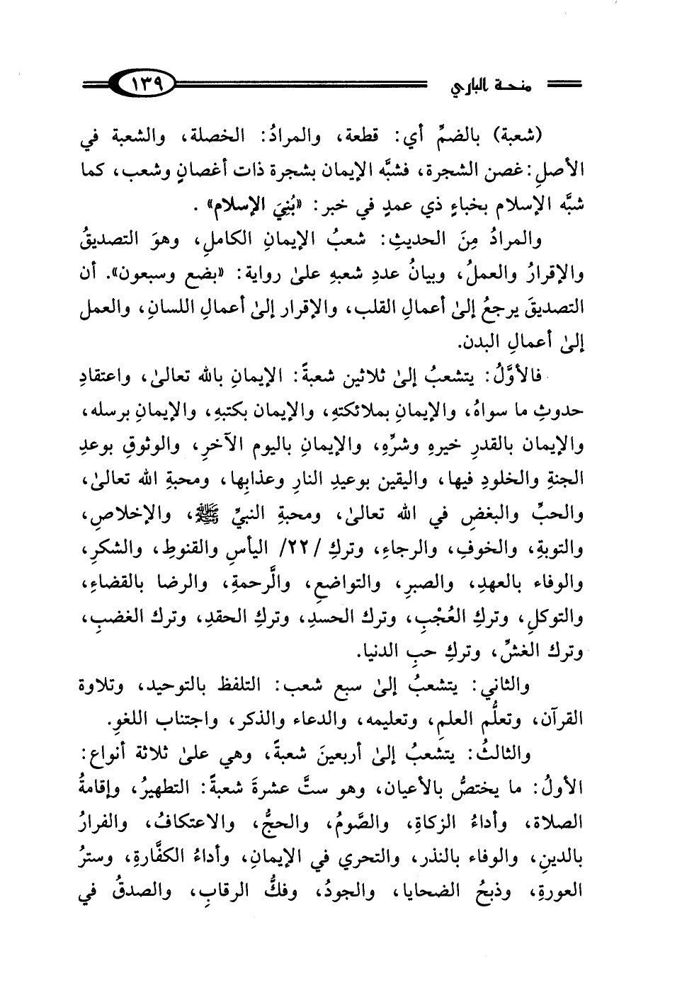 والثالثُ: يتشعبُ إلى أربعينَ شعبةَ، وهي على ثلاثة أنواع: الأولُ: ما يختصُّ بالأعيان، وهو ست عشرةَ شعبةً: التطهيرُ، وإقامةُ الصلاة، وأداءُ الزكاةِ، والصَّومُ، والحجُّ، والاعتكافُ، والفرارُ بالدينِ، والوفاء بالنذر، والتحري في الإيمانِ، وأداءُ الكفَّارةِ، وسترُ العورةِ، وذبحُ الضحايا، والجودُ، وفكُّ الرقابِ، والصدقُ في
