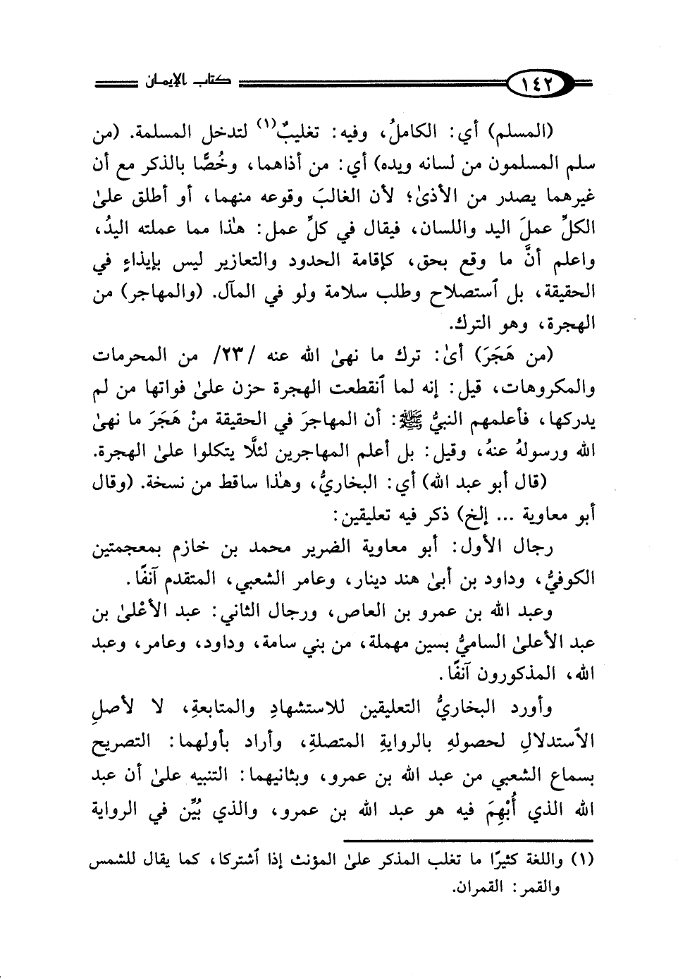 (المسلم) أي: الكاملُ، وفيه: تغليبٌ (¬1) لتدخل المسلمة. (من سلم المسلمون من لسانه ويده) أي: من أذاهما، وخُصَّا بالذكر مع أن غيرهما يصدر من الأذى؛ لأن الغالبَ وقوعه منهما، أو أطلق على الكلِّ عملَ اليد واللسان، فيقال في كلِّ عمل: هذا مما عملته اليدُ، واعلم أنَّ ما وقع بحق، كإقامة الحدود والتعازير ليس بإيذاءٍ في الحقيقة، بل استصلاح وطلب سلامة ولو في المآل. (والمهاجر) من الهجرة، وهو الترك.