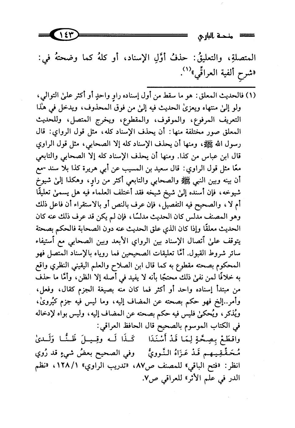 انظر: "فتح الباقي" للمصنف ص 87، "تدريب الراوي" 1/ 128، "نظم الدر في علم الأثر" للعراقي ص 7.