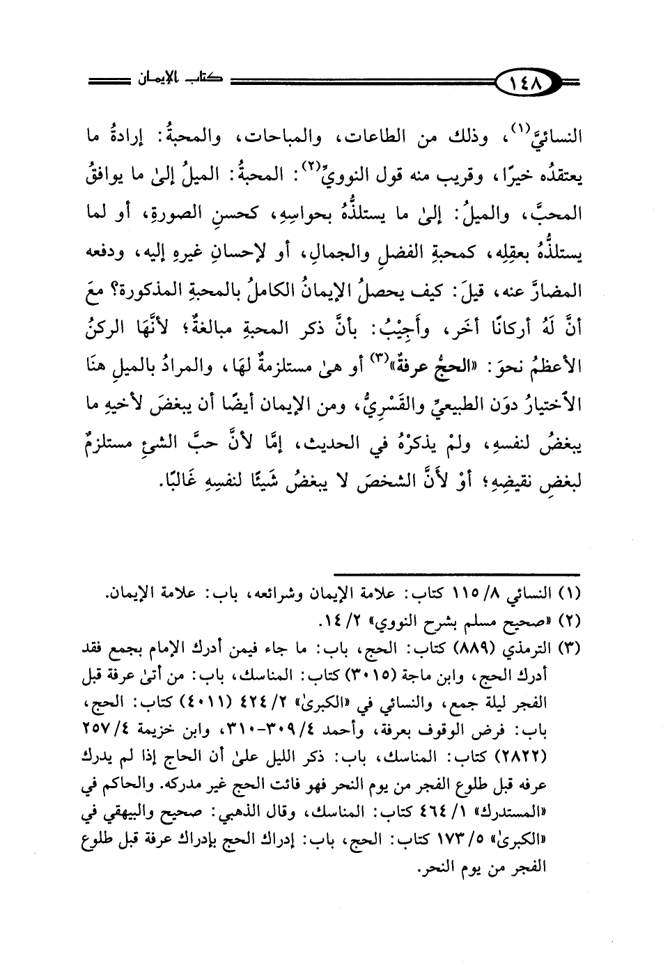 النسائيُّ (¬1)، وذلك من الطاعات، والمباحات، والمحبةُ: إرادةُ ما يعتقدُه خيرًا، وقريب منه قول النوويِّ (¬2): المحبةُ: الميلُ إلى ما يوافقُ المحبَّ، والميلُ: إلى ما يستلذُّهُ بحواسِهِ، كحسنِ الصورةِ، أو لما يستلذُّهُ بعقِلِه، كمحبةِ الفضلِ والجمالِ، أو لإحسانِ غيرهِ إليه، ودفعه المضارَّ عنه، قيلَ: كيف يحصلُ الإيمانُ الكاملُ بالمحبةِ المذكورة؟ معَ أنَّ لَهُ أركانًا أخَر، وأَجِيْبُ: بأنَّ ذكر المحبةِ مبالغةٌ؛ لأنَّهَا الركنُ الأعظمُ نحوَ: "الحجُّ عرفةٌ" (¬3) أو هي مستلزمةٌ لهَا، والمرادُ بالميلِ هنَا الاختيارُ دوَن الطبيعيِّ والقَسْرِيُّ، ومن الإيمان أيضًا أن يبغضَ لأخيهِ ما يبغضُ لنفسهِ، ولمْ يذكرْهُ في الحديث، إمَّا لأنَّ حبَّ الشيء مستلزمٌ لبغضِ نقيضِهِ؛ أوْ لأَنَّ الشخصَ لا يبغضُ شَيئًا لنفسِهِ غَالبًا.