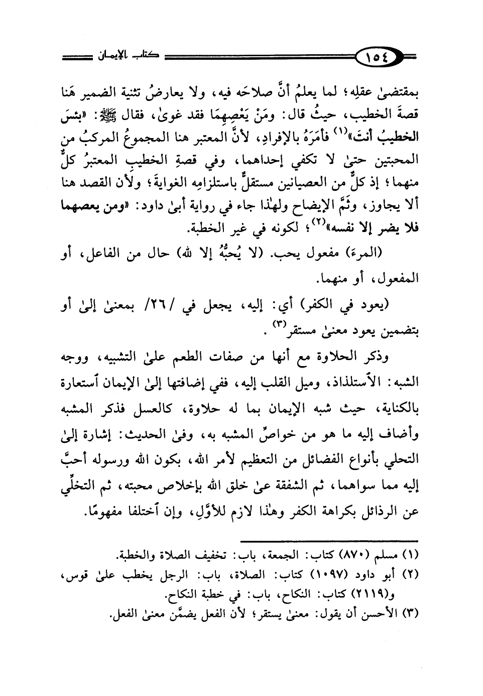 وذكر الحلاوة مع أنها من صفات الطعم على التشبيه، ووجه الشبه: الاستلذاذ، وميل القلب إليه، ففي إضافتها إلى الإيمان استعارة بالكناية، حيث شبه الإيمان بما له حلاوة، كالعسل فذكر المشبه وأضاف إليه ما هو من خواصِّ المشبه به، وفي الحديث: إشارة إلى التحلي بأنواع الفضائل من التعظيم لأمر الله، بكون الله ورسوله أحبَّ إليه مما سواهما، ثم الشفقة عى خلق الله بإخلاص محبته، ثم التخلِّي عن الرذائل بكراهة الكفر وهذا لازم للأوَّلِ، وإن اختلفا مفهومًا.