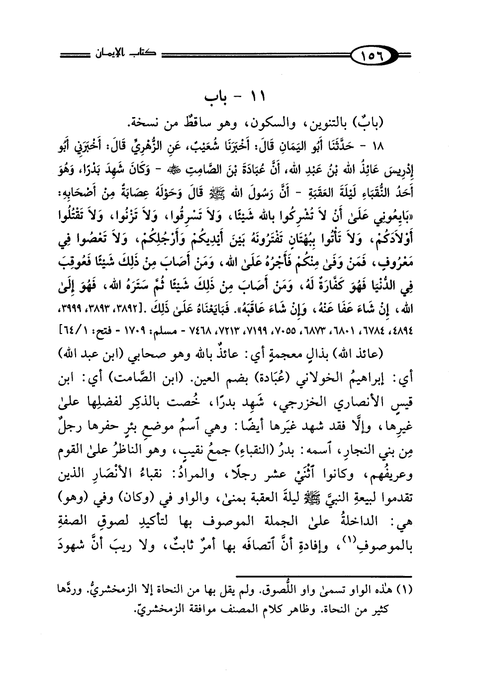 18 - حَدَّثَنَا أَبُو اليَمَانِ قَالَ: أَخْبَرَنَا شُعَيْبٌ، عَنِ الزُّهْرِيِّ، قَالَ: أَخْبَرَنِي أَبُو إِدْرِيسَ عَائِذُ اللَّهِ بْنُ عَبْدِ اللَّهِ، أَنَّ عُبَادَةَ بْنَ الصَّامِتِ رَضِيَ اللَّهُ عَنْهُ -وَكَانَ شَهِدَ بَدْرًا وَهُوَ أَحَدُ النُّقَبَاءِ لَيْلَةَ العَقَبَةِ- أَنَّ رَسُولَ اللَّهِ صَلَّى اللهُ عَلَيْهِ وَسَلَّمَ قَالَ، وَحَوْلَهُ عِصَابَةٌ مِنْ أَصْحَابِهِ: "بَايِعُونِي عَلَى أَنْ لَا تُشْرِكُوا بِاللَّهِ شَيْئًا، وَلَا تَسْرِقُوا، وَلَا تَزْنُوا، وَلَا تَقْتُلُوا أَوْلادَكُمْ، وَلَا تَأْتُوا بِبُهْتَانٍ تَفْتَرُونَهُ بَيْنَ أَيْدِيكُمْ وَأَرْجُلِكُمْ، وَلَا تَعْصُوا فِي مَعْرُوفٍ، فَمَنْ وَفَى مِنْكُمْ فَأَجْرُهُ عَلَى اللَّهِ، وَمَنْ أَصَابَ مِنْ ذَلِكَ شَيْئًا فَعُوقِبَ فِي الدُّنْيَا فَهُوَ كَفَّارَةٌ لَهُ، وَمَنْ أَصَابَ مِنْ ذَلِكَ شَيْئًا ثُمَّ سَتَرَهُ اللَّهُ فَهُوَ إِلَى اللَّهِ، إِنْ شَاءَ عَفَا عَنْهُ وَإِنْ شَاءَ عَاقَبَهُ" فَبَايَعْنَاهُ عَلَى ذَلِكَ.