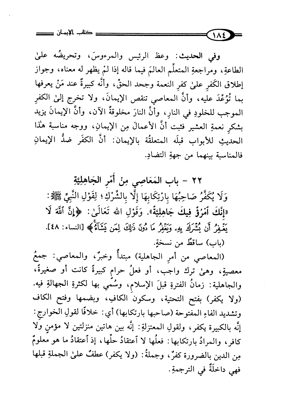 (المعاصي من أمرِ الجاهلية) مبتدأٌ وخبرٌ، والمعاصي: جمعُ معصيةٍ، وهي ترك واجب، أو فعلُ حرامٍ كبيرةً كانت أو صغيرة، والجاهلية: زمانُ الفترةِ قبلَ الإسلامِ، وسُمي بها لكثرةِ الجهالةِ فيه. (ولا يكفر) بفتح التحتية، وسكون الكافِ، وبضمها وفتح الكاف وتشديد الفاءِ المفتوحة (صاحبها بارتكابها) أي: خلافًا لقولِ الخوارجِ: إنَّه بالكبيرة يكفر، ولقولِ المعتزلةِ: إنَّه بين هاتين منزلتين لا مؤمنٍ ولا كافر، والمرادُ بارتكابها: فعلُها لا اعتقادُ حلِّها، إذ اعتقادُ ما هو معلومٌ مِن الدين بالضرورة كفرٌ، وجملةُ: (ولا يكفر) عطفٌ على الجملةِ قبلها فهي داخلَةٌ في الترجمةِ.