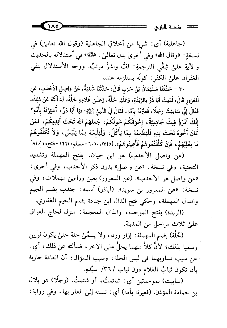30 - حَدَّثَنَا سُلَيْمَانُ بْنُ حَرْبٍ، قَالَ: حَدَّثَنَا شُعْبَةُ، عَنْ وَاصِلٍ الأَحْدَبِ، عَنِ المَعْرُورِ بْنِ سُوَيْدٍ، قَالَ: لَقِيتُ أَبَا ذَرٍّ بِالرَّبَذَةِ، وَعَلَيْهِ حُلَّةٌ، وَعَلَى غُلامِهِ حُلَّةٌ، فَسَأَلْتُهُ عَنْ ذَلِكَ، فَقَالَ: إِنِّي سَابَبْتُ رَجُلًا فَعَيَّرْتُهُ بِأُمِّهِ، فَقَالَ لِي النَّبِيُّ صَلَّى اللهُ عَلَيْهِ وَسَلَّمَ: "يَا أَبَا ذَرٍّ أَعَيَّرْتَهُ بِأُمِّهِ؟ إِنَّكَ امْرُؤٌ فِيكَ جَاهِلِيَّةٌ، إِخْوَانُكُمْ خَوَلُكُمْ، جَعَلَهُمُ اللَّهُ تَحْتَ أَيْدِيكُمْ، فَمَنْ كَانَ أَخُوهُ تَحْتَ يَدِهِ، فَلْيُطْعِمْهُ مِمَّا يَأْكُلُ، وَلْيُلْبِسْهُ مِمَّا يَلْبَسُ، وَلَا تُكَلِّفُوهُمْ مَا يَغْلِبُهُمْ، فَإِنْ كَلَّفْتُمُوهُمْ فَأَعِينُوهُمْ".