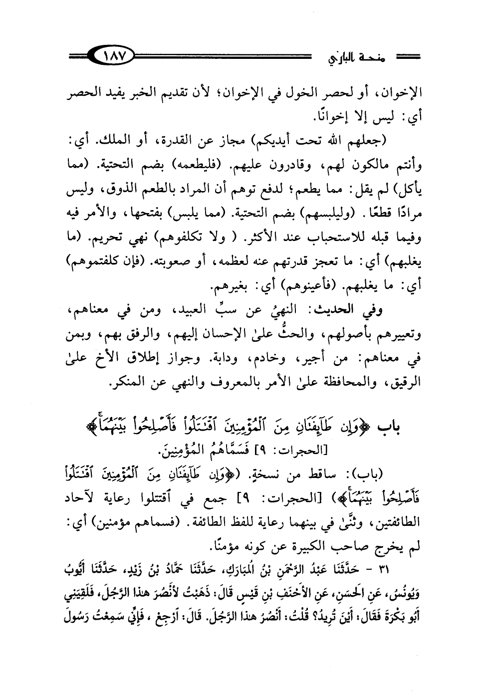(باب): ساقط من نسخةٍ. {وَإِنْ طَائِفَتَانِ مِنَ المُؤْمِنِينَ اقْتَتَلُوا فَأَصْلِحُوا بَيْنَهُمَا} [الحجرات: 9] جمع في اقتتلوا رعاية لآحاد الطائفتين، وثنَّى في بينهما رعاية للفظ الطائفة. (فسماهم مؤمنين) أي: لم يخرج صاحب الكبيرة عن كونه مؤمنًا.