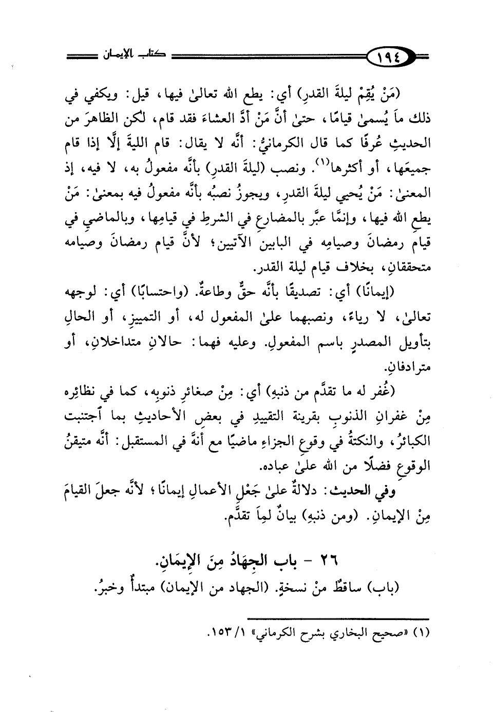 (إيمانًا) أي: تصديقًا بأنَّه حقٌّ وطاعةٌ. (واحتسابًا) أي: لوجهه تعالى، لا رياءً، ونصبهما على المفعول له، أو التمييزِ، أو الحالِ بتأويل المصدر باسم المفعولِ. وعليه فهما: حالانِ متداخلانِ، أو مترادفانِ.