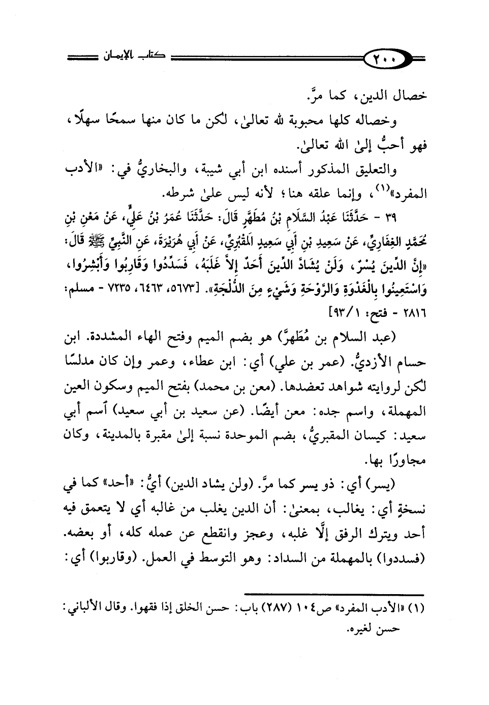 31 - حَدَّثَنَا عَبْدُ السَّلامِ بْنُ مُطَهَّرٍ، قَالَ: حَدَّثَنَا عُمَرُ بْنُ عَلِيٍّ، عَنْ مَعْنِ بْنِ مُحَمَّدٍ الغِفَارِيِّ، عَنْ سَعِيدِ بْنِ أَبِي سَعِيدٍ المَقْبُرِيِّ، عَنْ أَبِي هُرَيْرَةَ، عَنِ النَّبِيِّ صَلَّى اللهُ عَلَيْهِ وَسَلَّمَ قَالَ: "إِنَّ الدِّينَ يُسْرٌ، وَلَنْ يُشَادَّ الدِّينَ أَحَدٌ إلا غَلَبَهُ، فَسَدِّدُوا وَقَارِبُوا، وَأَبْشِرُوا، وَاسْتَعِينُوا بِالْغَدْوَةِ وَالرَّوْحَةِ وَشَيْءٍ مِنَ الدُّلْجَةِ".