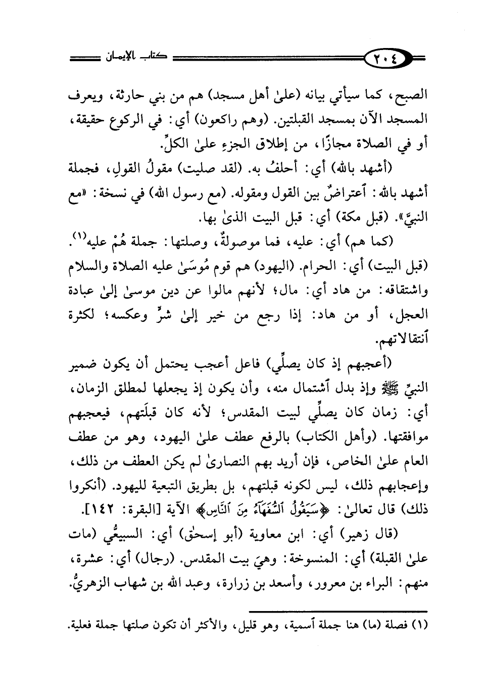 (أعجبهم إذ كان يصلِّي) فاعل أعجب يحتمل أن يكون ضمير النَّبيِّ - صلى الله عليه وسلم - وإذ بدل اشتمال منه، وأن يكون إذ يجعلها لمطلق الزمان، أي: زمان كان يصلي لبيت المقدس؛ لأنه كان قبلَتهم، فيعجبهم موافقتها. (وأهل الكتاب) بالرفع عطف على اليهود، وهو من عطف العام على الخاص، فإن أريد بهم النصارى لم يكن العطف من ذلك، وإعجابهم ذلك، ليس لكونه قبلتهم، بل بطريق التبعية لليهود. (أنكروا ذلك) قال تعالى: {سَيَقُولُ السُّفَهَاءُ مِنَ النَّاسِ} الآية [البقرة: 142].