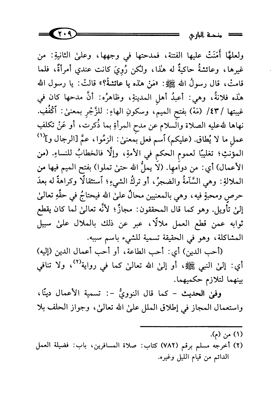 ولعلهَّا أَمَنَتْ عليها الفتنة، فمدحتها في وجهها، وعلى الثانيةِ: من غيرها، وعائشةُ حاكيةٌ له هذا، ولكن رُويَ كانت عندي امرأة، فلما قامتْ، قال رسولُ الله - صلى الله عليه وسلم -: "مَنْ هذه يا عائشةُ؟ " قالتْ: يا رسول الله هذه فلانةُ، وهي: أعبدُ أهلِ المدينةِ، وظاهرُه: أنَّ مدحها كان في غيبتها (مَهْ) بفتحِ الميم، وسكونِ الهاءِ: للزَّجْرِ بمعنى: اكْفُفِ. نهاها لله عليه الصلاة والسلام عن مدحِ المرأةِ بما ذُكرت، أو عَنْ تكلفِ عملِ ما لا يُطاق. (عليكم) اسم فعل بمعنى: الزمُوا، عمَّ [الرجال و] (¬1) المؤنثِ؛ تغليبًا لعمومِ الحكمِ في الأمةِ، وإلَّا فالخطابُ للنساءِ. (من الأعمال) أي: من دوامهِا. إلا يملُّ الله حتى تملوا) بفتح الميم فيها من الملالةِ: وهي السَّامةُ والضجرُ، أو تركُ الشيءِ؛ استثقالًا وكراهةً له بعدَ حرصٍ ومحبةٍ فيه، وهي بالمعنيين محالٌ على الله فيحتاجُ في حقهِ تعالى إلى تأويل. وهو كما قال المحققون: مجازٌ؛ لأنَّه تعالى لما كان يقطع ثوابه عمن قطع العمل ملالًا، عبر عن ذلك بالملال على سبيل المشاكلة، وهو في الحقيقة تسمية للشيء باسم سببه.