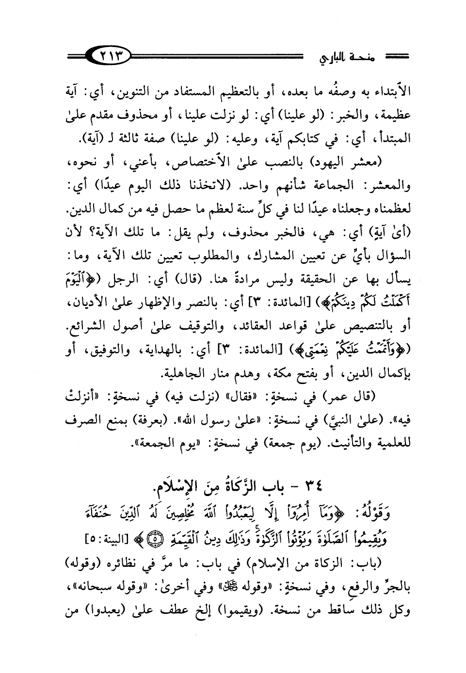 (قال عمر) في نسخةٍ: "فقال" (نزلت فيه) في نسخةٍ: "أنزلتْ فيه". (على النَّبيِّ) في نسخةٍ: "على رسول الله". (بعرفة) بمنع الصرف للعلمية والتأنيث. (يوم جمعة) في نسخةٍ: "يوم الجمعة".