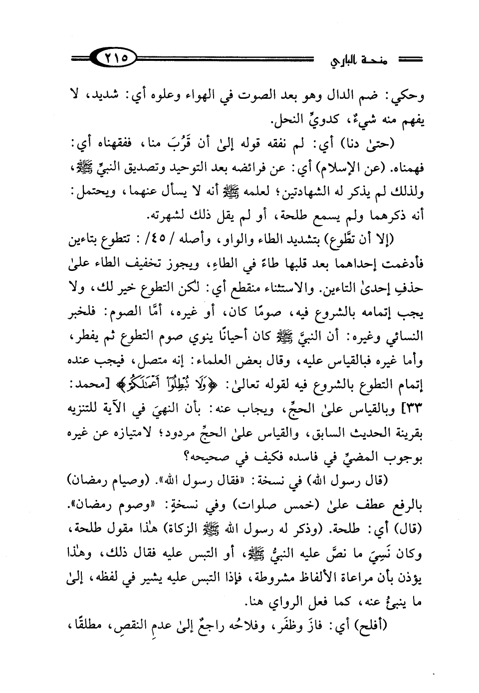 (حتى دنا) أي: لم نفقه قوله إلى أن قَرُبَ منا، ففقهناه أي: فهمناه. (عن الإسلام) أي: عن فرائضه بعد التوحيد وتصديق النَّبيِّ - صَلَّى الله عليه وسلم -، ولذلك لم يذكر له الشهادتين؛ لعلمه - صلى الله عليه وسلم - أنه لا يسأل عنهما، ويحتمل: أنه ذكرهما ولم يسمع طلحة، أو لم يقل ذلك لشهرته.