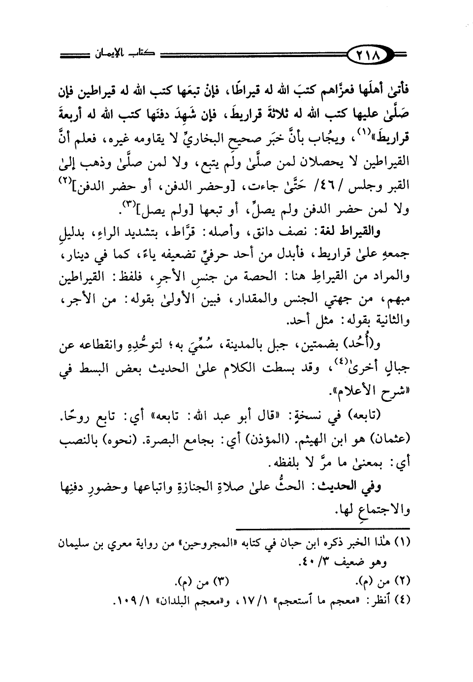 فأتى أهلَها فعزَّاهم كتبَ الله له قيراطًا، فإن تبعَها كتب الله له قيراطين فإن صَلَّى عليها كتب الله له ثلاثةَ قراريطَ، فإن شَهِدَ دفنَها كتب الله له أربعةَ قراريطَ" (¬1)، ويجُاب بأنَّ خبَر صحيحِ البخاريِّ لا يقاومه غيره، فعلم أنَّ القيراطين لا يحصلان لمن صلَّى ولم يتبع، ولا لمن صلَّى وذهب إلى القبر وجلس حتَّى جاءت، [وحضر الدفن، أو حضر الدفن] (¬2) ولا لمن حضر الدفن ولم يصلِّ، أو تبعها [ولم يصل] (¬3).