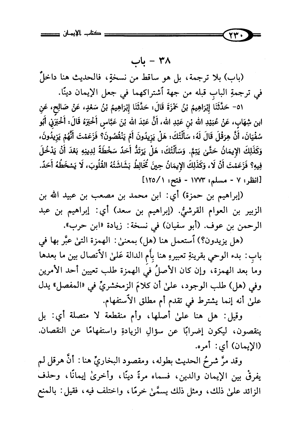 51 - حَدَّثَنَا إِبْرَاهِيمُ بْنُ حَمْزَةَ، قَالَ: حَدَّثَنَا إِبْرَاهِيمُ بْنُ سَعْدٍ، عَنْ صَالِحٍ، عَنِ ابْنِ شِهَابٍ، عَنْ عُبَيْدِ اللَّهِ بْنِ عَبْدِ اللَّهِ، أَنَّ عَبْدَ اللَّهِ بْنَ عَبَّاسٍ، أَخْبَرَهُ قَالَ: أَخْبَرَنِي أَبُو سُفْيَانَ بْنُ حَرْبٍ، " أَنَّ هِرَقْلَ، قَالَ لَهُ: سَأَلْتُكَ هَلْ يَزِيدُونَ أَمْ يَنْقُصُونَ؟ فَزَعَمْتَ أَنَّهُمْ يَزِيدُونَ، وَكَذَلِكَ الإِيمَانُ حَتَّى يَتِمَّ، وَسَأَلْتُكَ هَلْ يَرْتَدُّ أَحَدٌ سَخْطَةً لِدِينِهِ بَعْدَ أَنْ يَدْخُلَ فِيهِ؟ فَزَعَمْتَ أَنْ لَا، وَكَذَلِكَ الإِيمَانُ، حِينَ تُخَالِطُ بَشَاشَتُهُ القُلُوبَ لَا يَسْخَطُهُ أَحَدٌ" [انظر: 7 - مسلم: 1773 - فتح: 1/ 125]